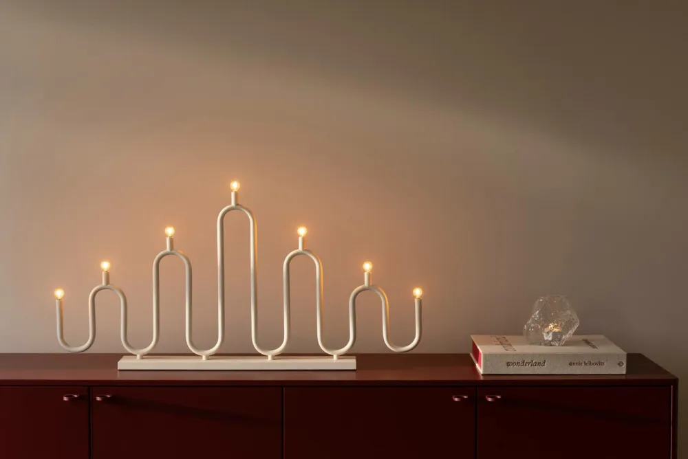 Noel har et blødt og bølgende formsprog, hvor metalrørene er bøjet i hånden i forskellige niveauer, hvilket skaber den klassiske form af en adventsstage. Noel ser lige så godt ud i vinduet som på et sidebord. Lampen leveres med et 200 cm langt sort kabel med sort afbryder, transformer og europastik. Undersiden er dækket af filt for at beskytte overflader mod ridser. Denne lampe er kompatibel med E10-pærer, maks. 3W/34V, lyskilder er inkluderet. (Ac/Dc, 34V, 0,25W, 2700K, 14lm).