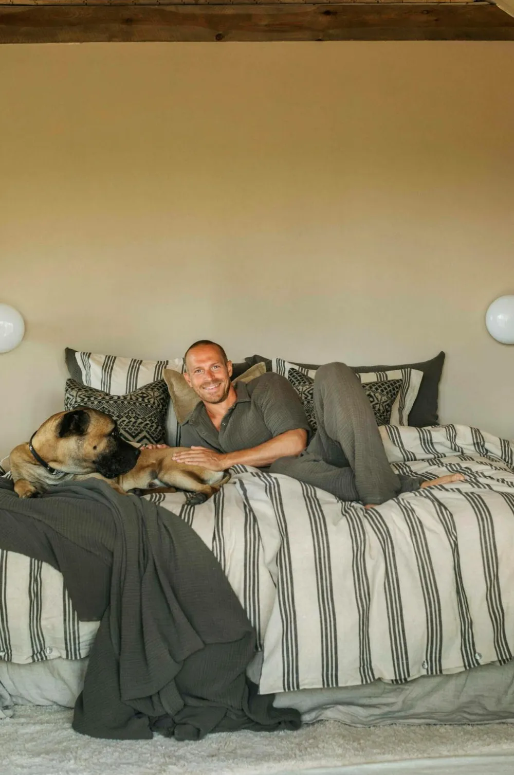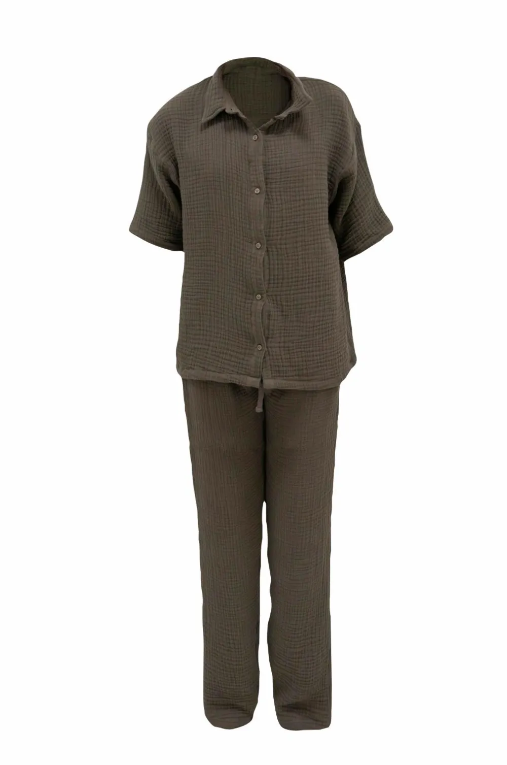 Et behageligt og hyggeligt pyjamassæt fra Gustav Ovland lavet af 100% bomuldsmuslin. Perfekt loungewear til dig, der gerne vil skifte til noget behageligt og luftigt, når du ligger hjemme i sofaen – og samtidig se frisk ud. – 100% bomuldsmuslin, 4 lag – pyjamassæt bestående af bukser og en t-shirt – bukserne har bindebånd i taljen – fås i størrelserne s/m og l/xl – brystlomme på t-shirten og baglomme på bukserne – dette produkt er en del af Gustav Ovlands kollektion, stärkelsesfabriken.