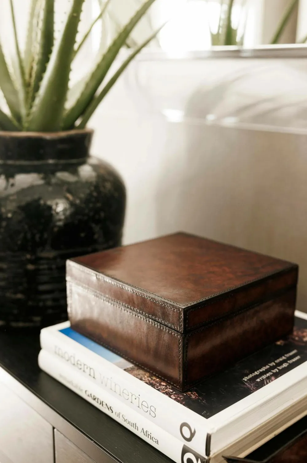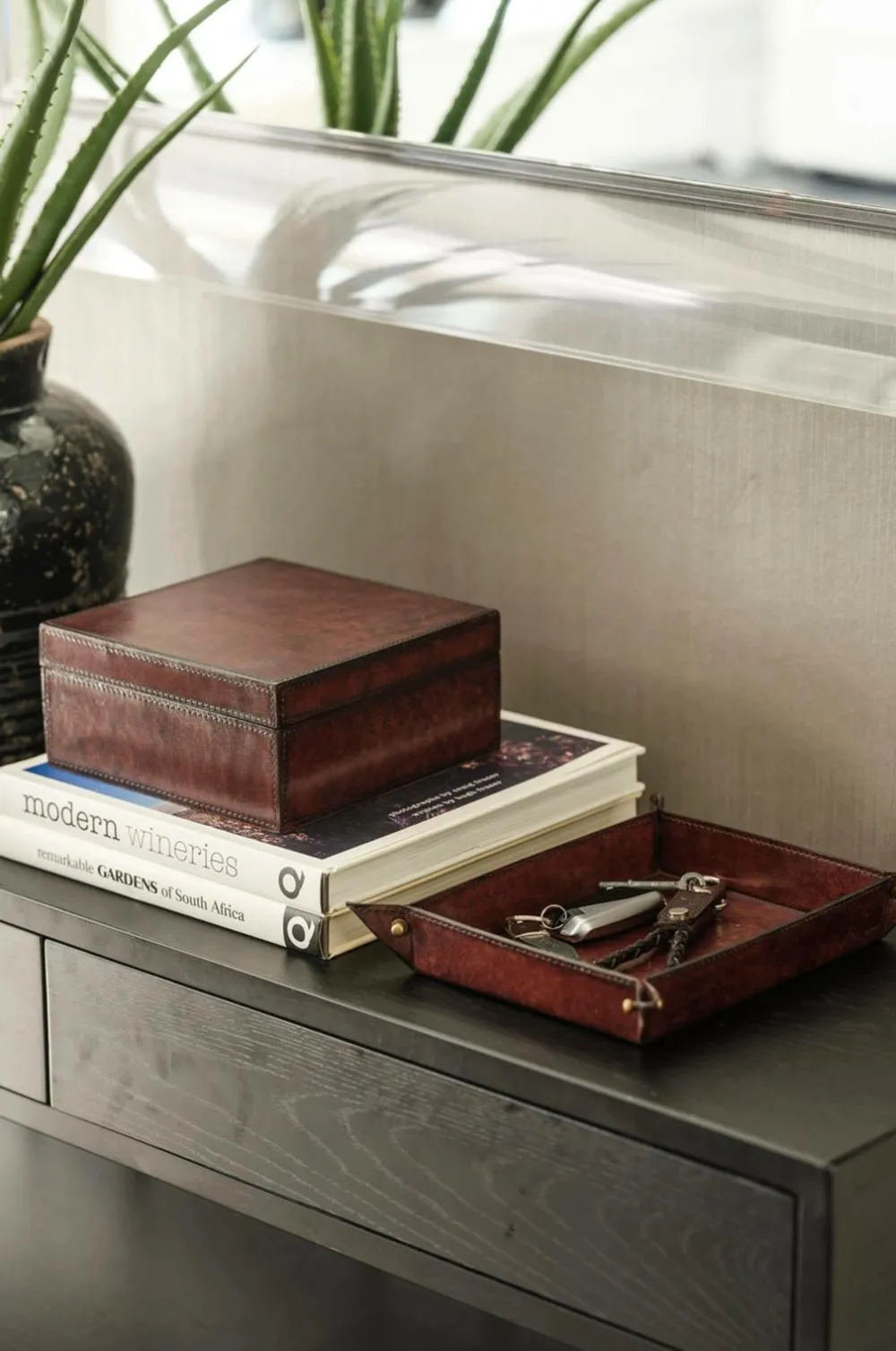 Denne elegante læderboks er perfekt til opbevaring af nøgler, småting eller som en stilfuld opbevaringsløsning på skrivebordet. Den giver et sofistikeret præg til gangen, stuen eller kontoret og holder dine ejendele både organiserede og let tilgængelige. Materiale: læder. Læderæsken er en del af Halvor Bakkens kollektion