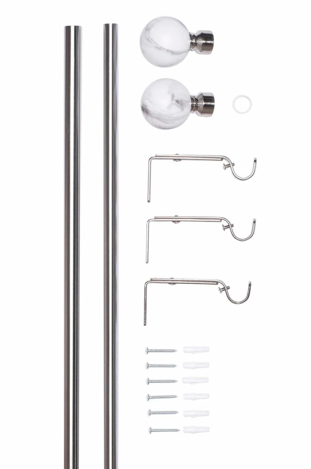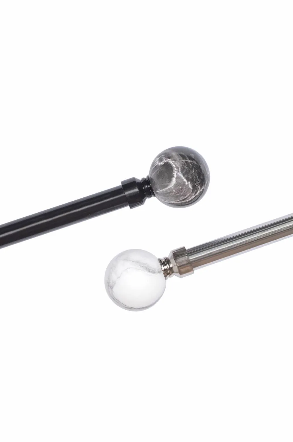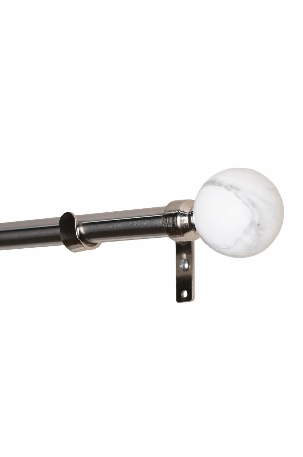 Komplet gardinstang i metal (16/19 mm) med kugleformede finials i marmor. Sættet indeholder justerbare stænger (110-200 cm), 2 finials og 3 justerbare vægbeslag (7-9 cm).