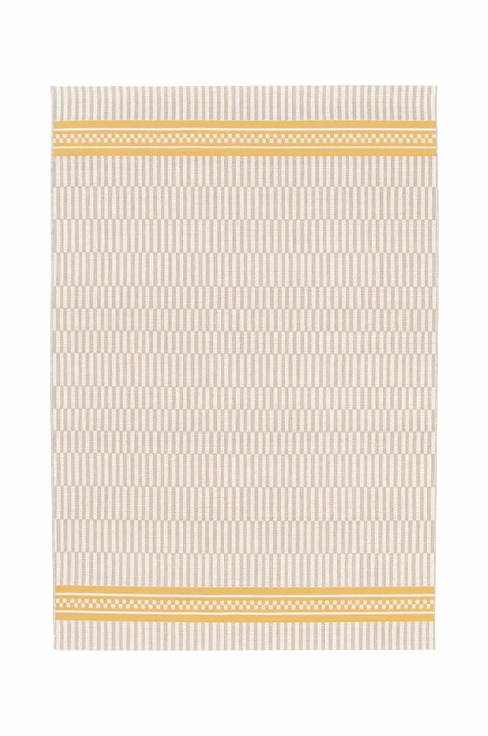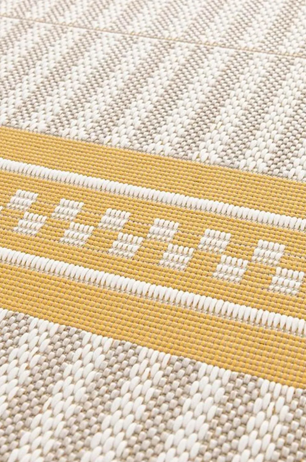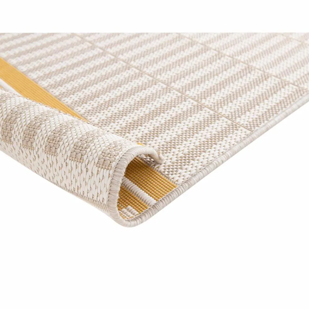 Mønstret udendørstæppe i et moderne udtryk med et detaljeret mønster i gul kontrastfarve. Stoffet har en glat struktur med et tåleligt stribet udtryk. Forstærk rumfornemmelsen og skab en hyggelig terrasse eller altan.