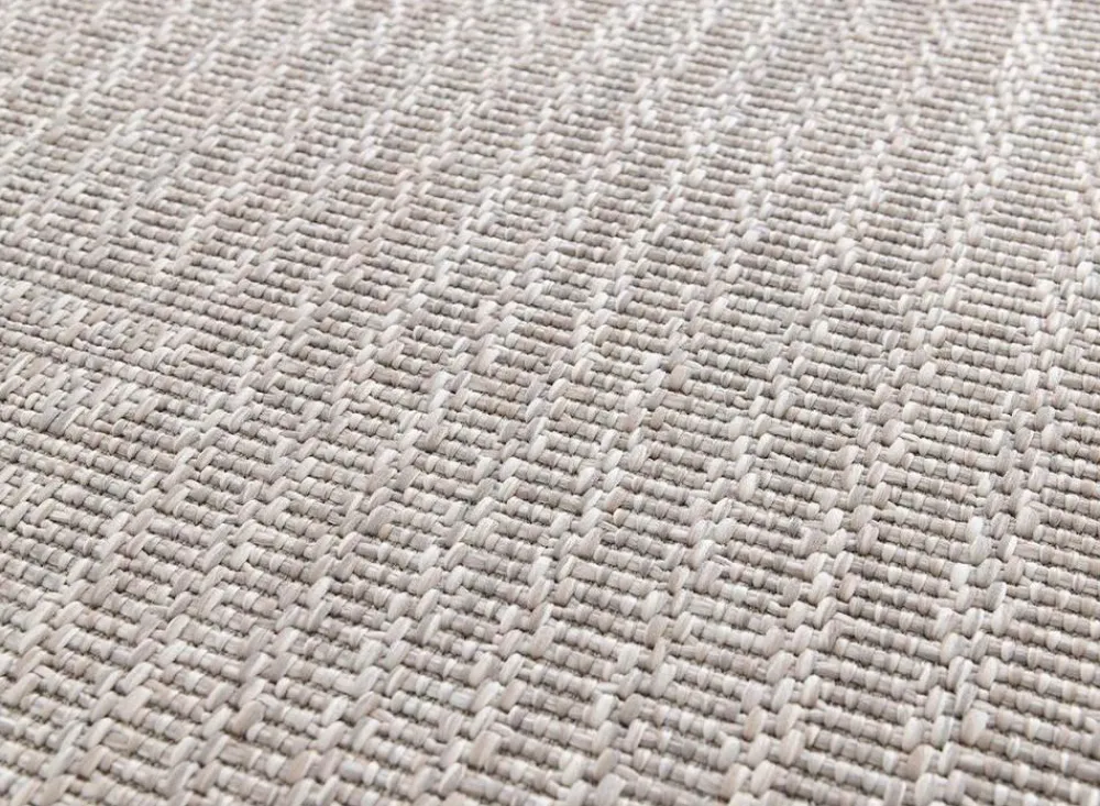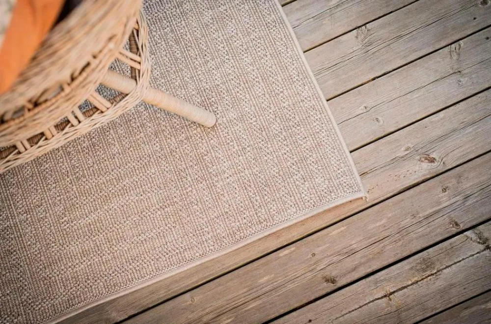 Den tykke flade vævning giver tæppet et tidløst sisal-look med naturlige farver, hvilket gør det perfekt til både udendørs og indendørs miljøer.