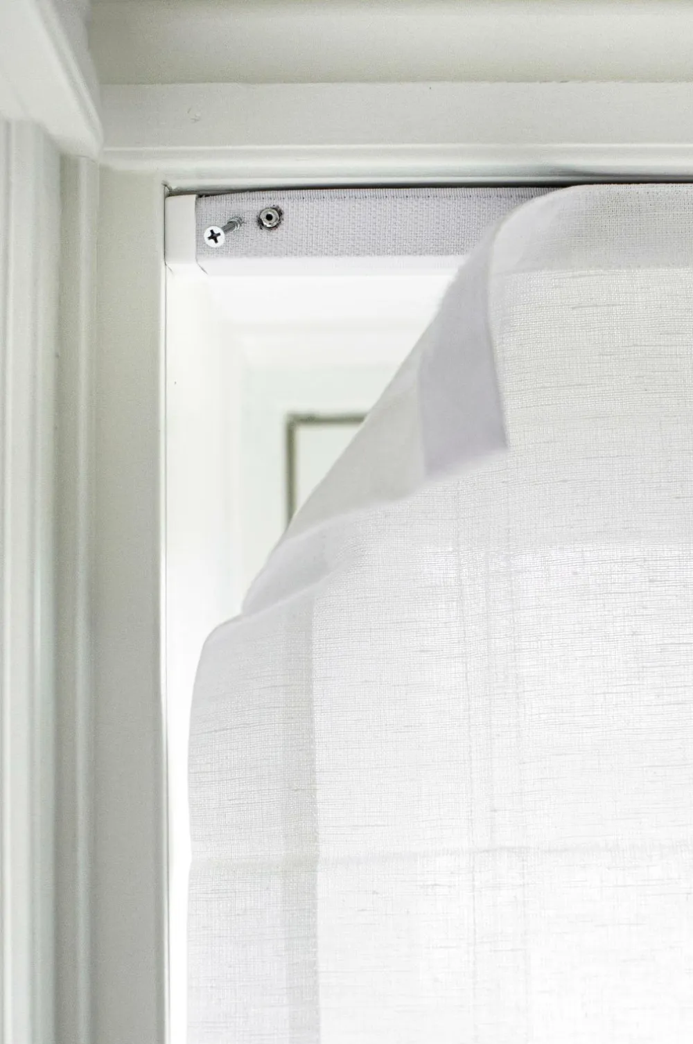 Gardinet er udstyret med en skjult metalskinne 15 cm fra bunden. Dette giver gardinet et tungt fald og folder pænt og jævnt, når du trækker det op. Metalskinnen kan fjernes før vask. Skinne og skrue til montering på væg/loft medfølger. Skinnen, som gardinet er monteret med, er 2 cm høj og 2,5 cm dyb. Tørrensning