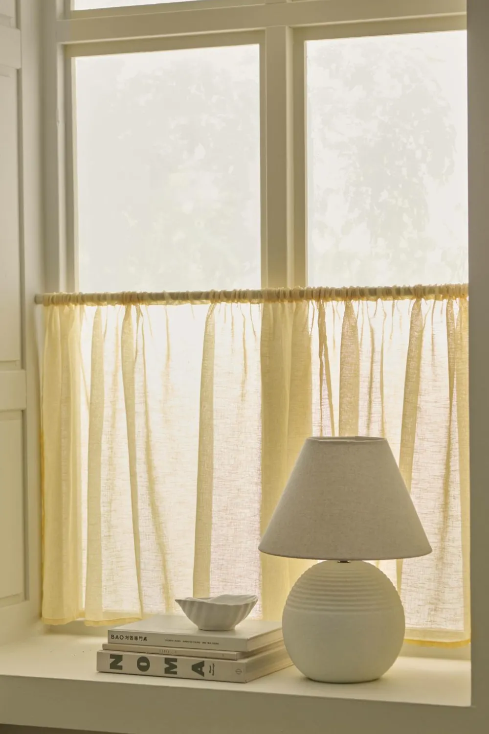 • Café-gardin i åbent stof, blød polyester