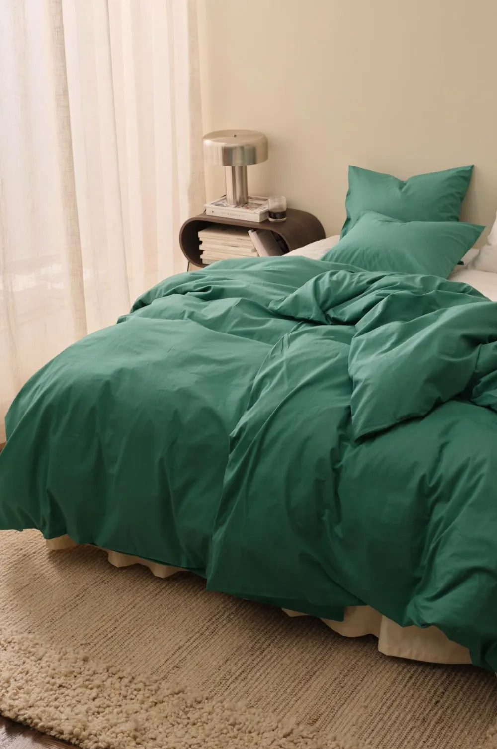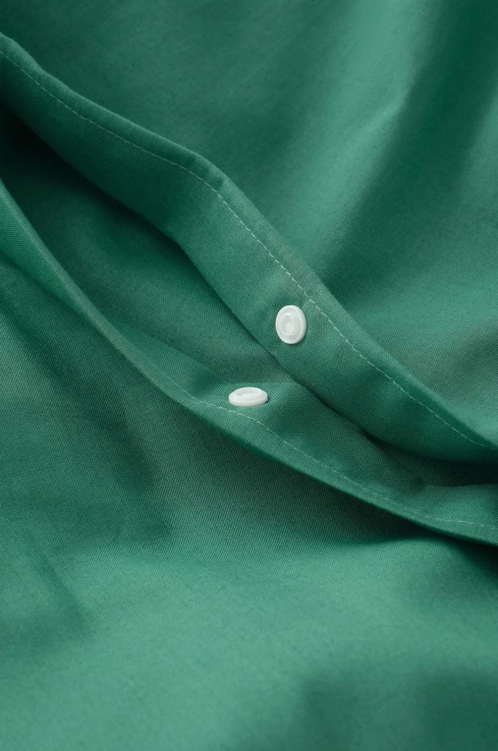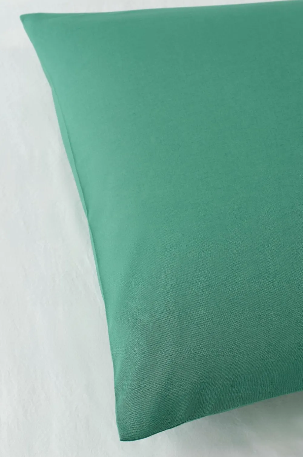 Ensfarvet sengesæt i blød, vasket bomuld. Trådtæthed 144 TC. Dynebetræk med huller i siden til brug ved opredning.