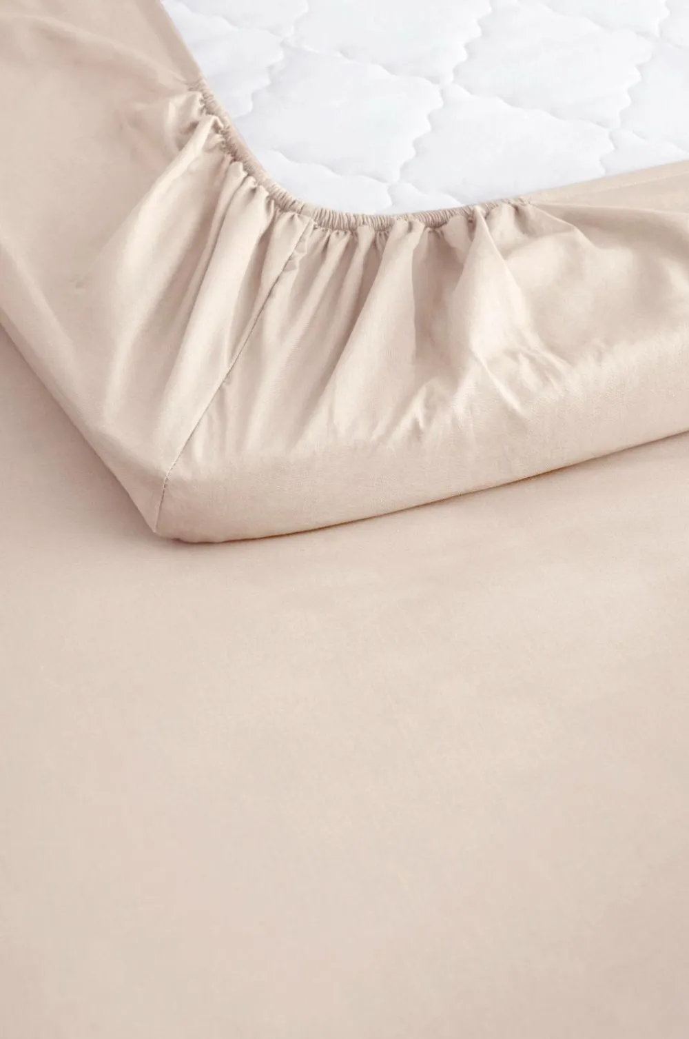 Faconsyet lagen i blød bomuld. Trådtæthed 144 TC. Elastikbånd i hjørnerne. Hjørneelastik 25 cm. Passer til madrasser op til 10 cm.