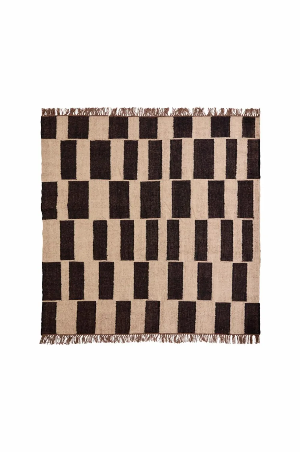 de dristige sorte og naturlige toner kommer til live i et asymmetrisk mønster, afsluttet med legende frynser for et blødt, indbydende touch.