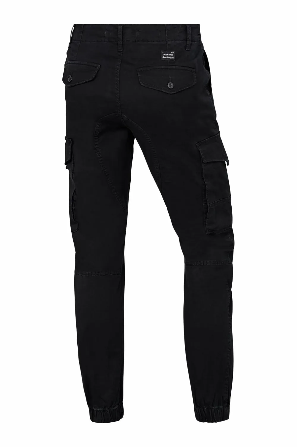 Cargobuks jjiPaul jjFlake AKM 542 fra Jack & Jones i blød, vævet stretchkvalitet. Tapered fit, rummelig pasform foroven og bukseben der bliver smallere nedefter. Linning med bæltestropper, knap og gylp med lynlås. Tre lommer foran og to baglommer med snydeklap og knap. To benlommer med lommeklap og skjult trykknap. Elastik i benkanten.