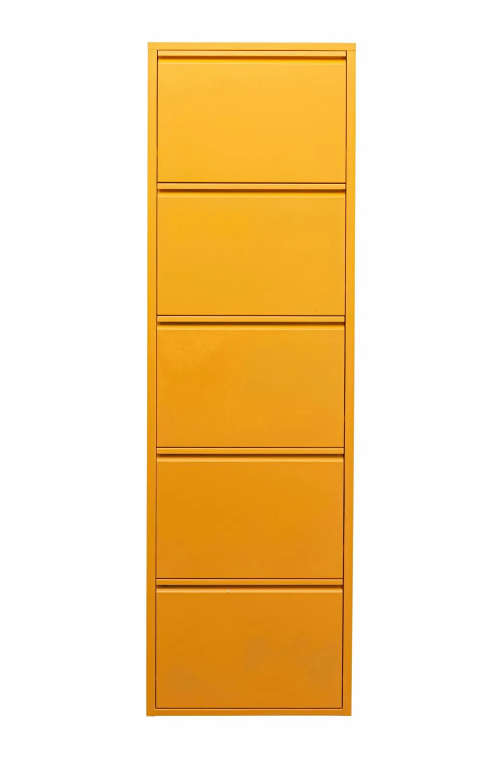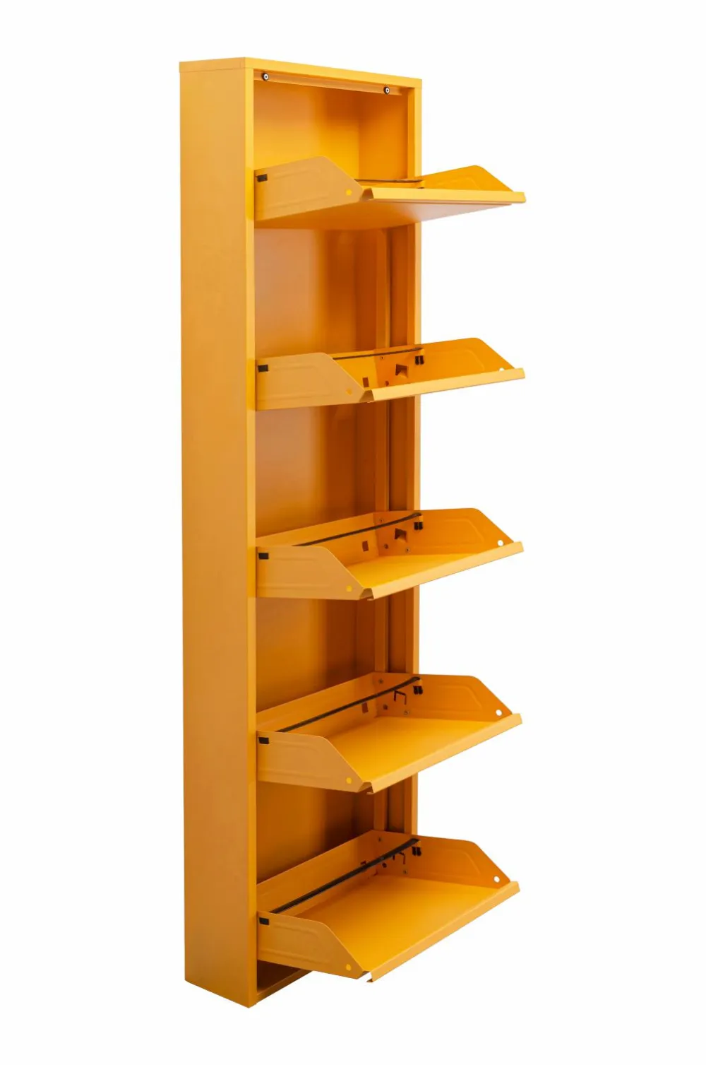 Indretningsideer til gangen eller soveværelset bør helt sikkert også tilbyde løsninger til opbevaring af sko. Du kan få plads til både kondisko, loafers og højhælede sko i en skotøjsæske. Dens uovertrufne fordel er dens lave dybde. Det betyder, at det slanke metalskoskab ikke fylder ret meget, selv om du har begrænset gulvplads. Indretningstip: Hvis du vil have et ensartet look i en lang gang, skal du installere flere skoskabe på rad og række. Og forresten kan disse skoreoler også hænges lidt højere op på væggen!