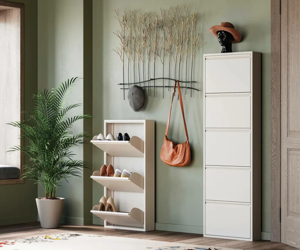 Man kan aldrig få for mange sko, vel? De skal bare opbevares rigtigt. Denne skoekspert tager sig hellere end gerne af det: et skoskab i et lige, slankt design som står op ad væggen. Med praktiske rum der kan klappes ud.
