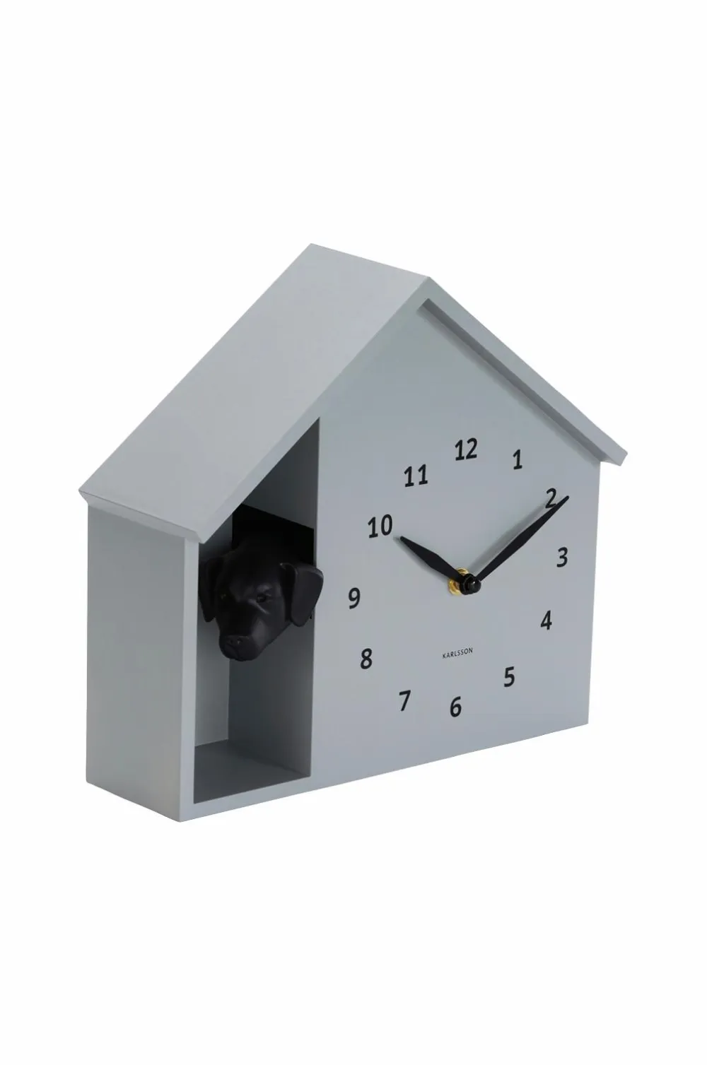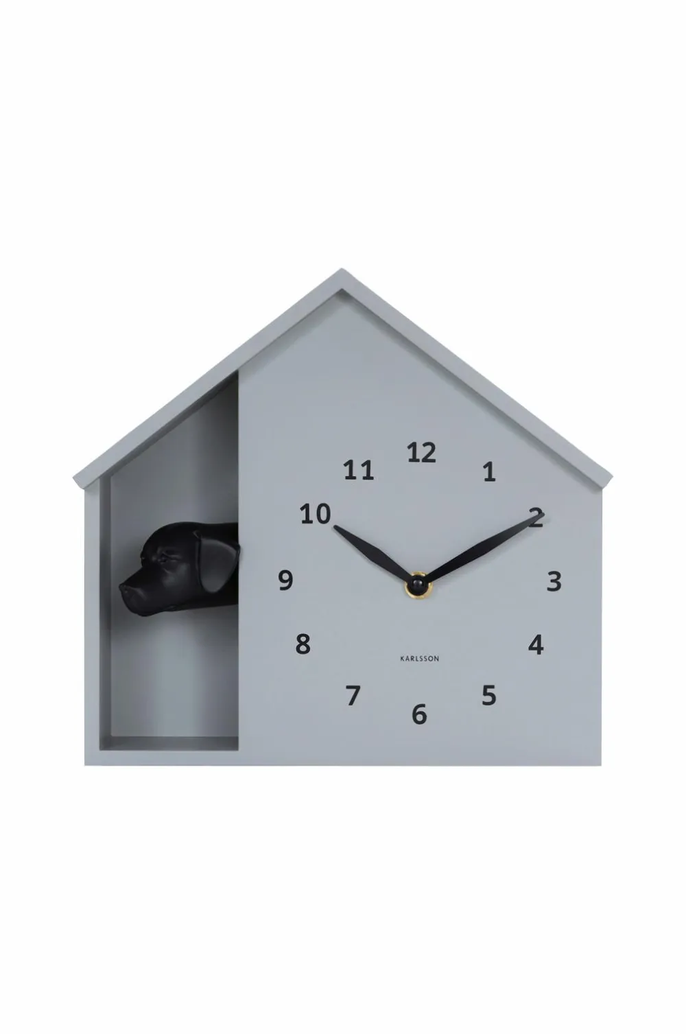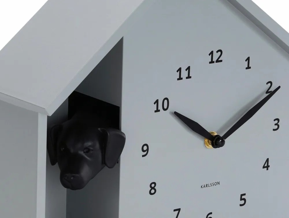 Dette legesyge vægur er en hilsen til alle hundeejere. Inde i det charmerende lille hus kigger en hund nysgerrigt frem om hjørnet, klar til at hjælpe dig med at planlægge din dag. Hver time gøer han, hvilket gør uret ikke kun funktionelt, men også til et karakteristisk element i rummet. Perfekt som et iøjnefaldende accent i et børneværelse, stue eller entre. Det tidløse design og de overraskende detaljer gør dette ur til et unikt blikfang.