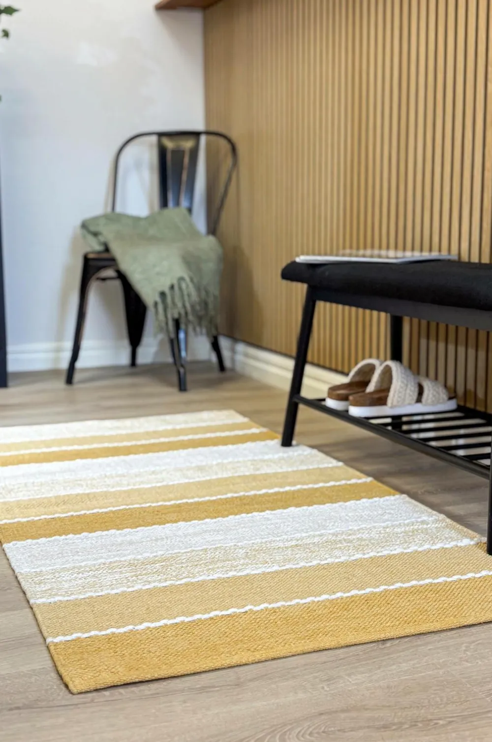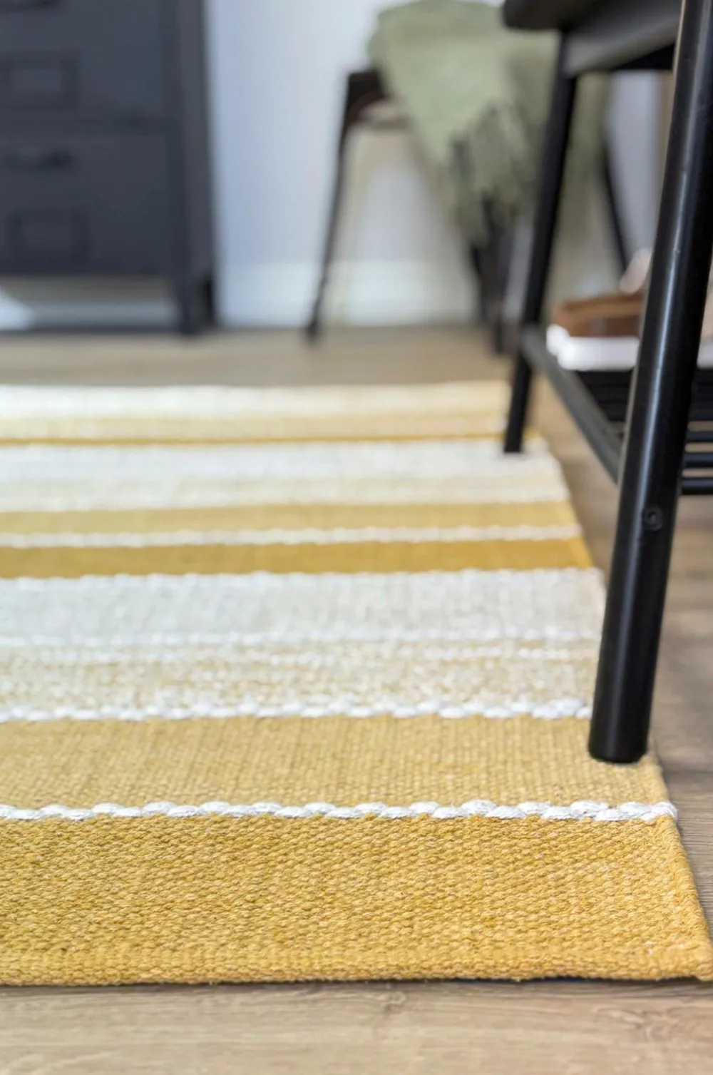 Stribede garntæpper kan håndvaskes i koldt vand med sæbe eller et mildt rengøringsmiddel. Skrub forsigtigt med en blød børste i stribernes retning på begge sider, og skyl derefter grundigt.