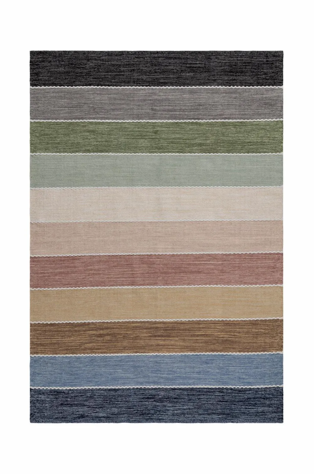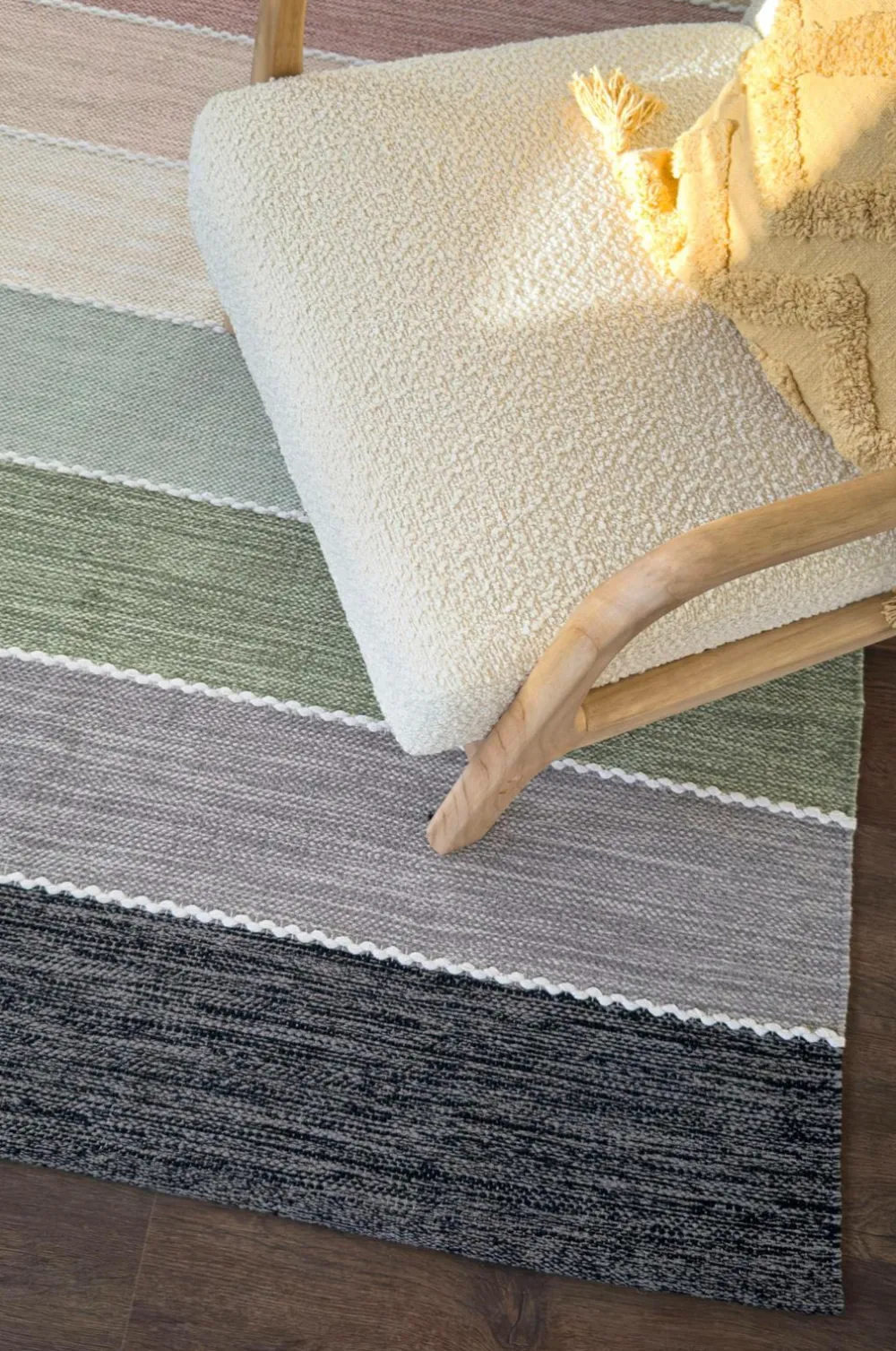 nyhamn multi er et stilfuldt håndvævet garntæppe med bløde pastelstriber, der giver et levende touch til ethvert rum. Farverne går gradvist fra mørkere nuancer i kanterne til lysere toner i midten, mens hvide sømme elegant fremhæver overgangene.