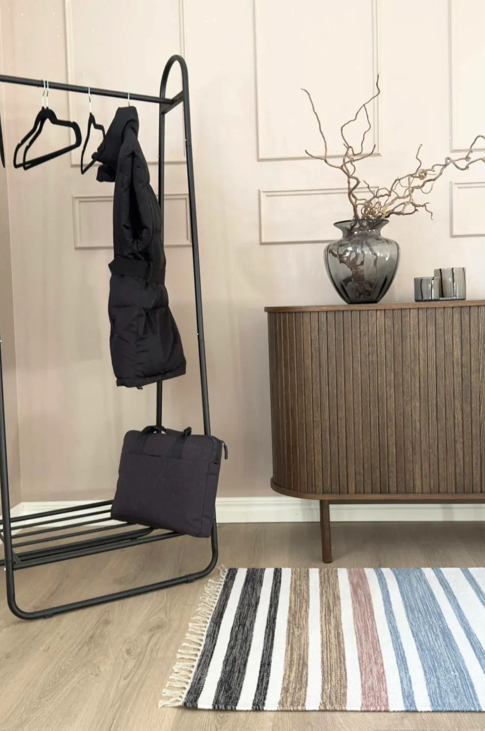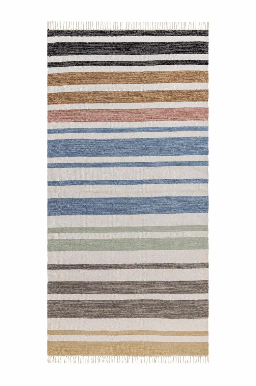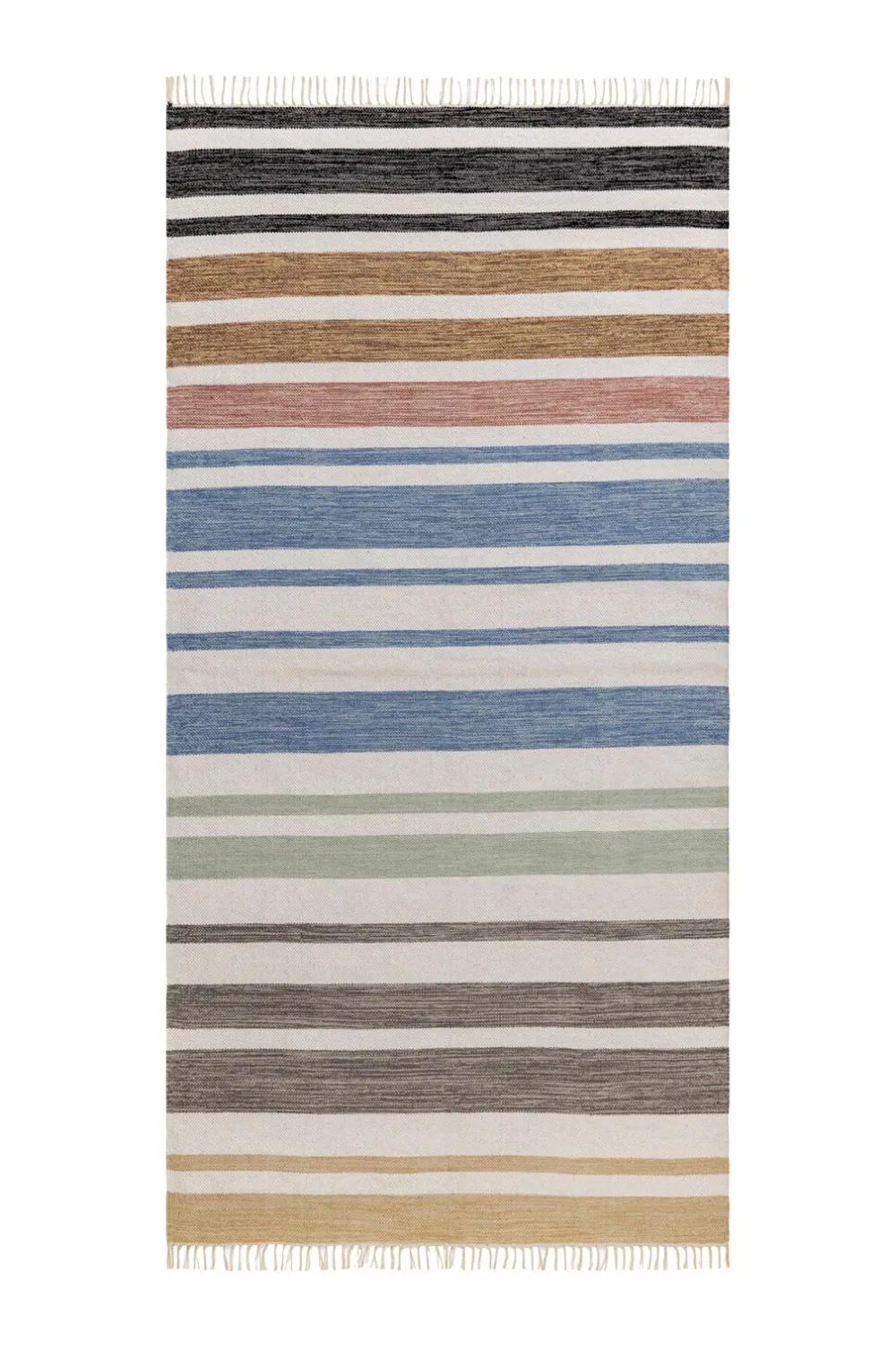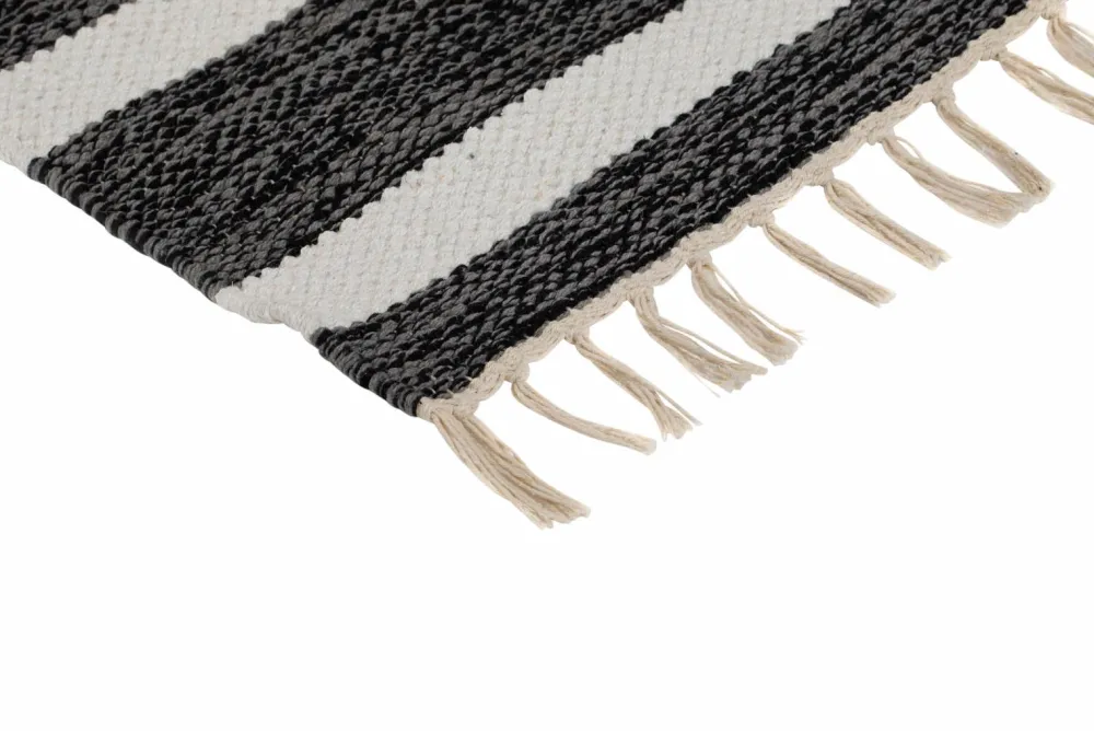 Dette tæppe er vævet af ren bomuld og er både slidstærkt og blødt, hvilket gør det til en perfekt tilføjelse til både moderne køkkener og hyggelige hjem på landet. Da hvert tæppe er håndlavet, kan der forekomme små variationer i vævning, farve og størrelse, hvilket gør hvert stykke unikt. En størrelsesvariation på ca. 3-5 % i forhold til de angivne mål er også en naturlig del af den håndværksmæssige produktionsproces.