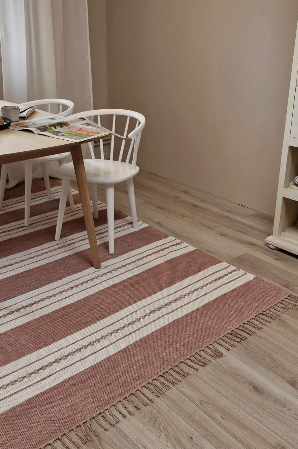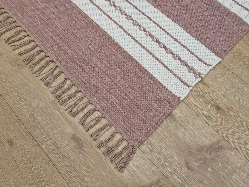 Dette er et håndvævet bomuldstæppe, hvilket betyder, at mønster og farve kan variere, hvilket gør hvert tæppe unikt. Tæppet er vævet i ren bomuld, hvilket gør det både blødt, slidstærkt og holdbart. Det skaber en hyggelig følelse, der giver liv og samtidig dæmper lyd.