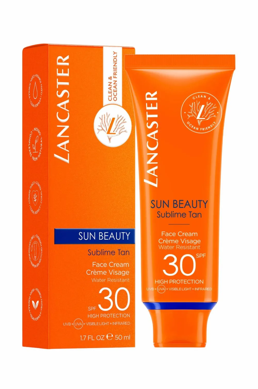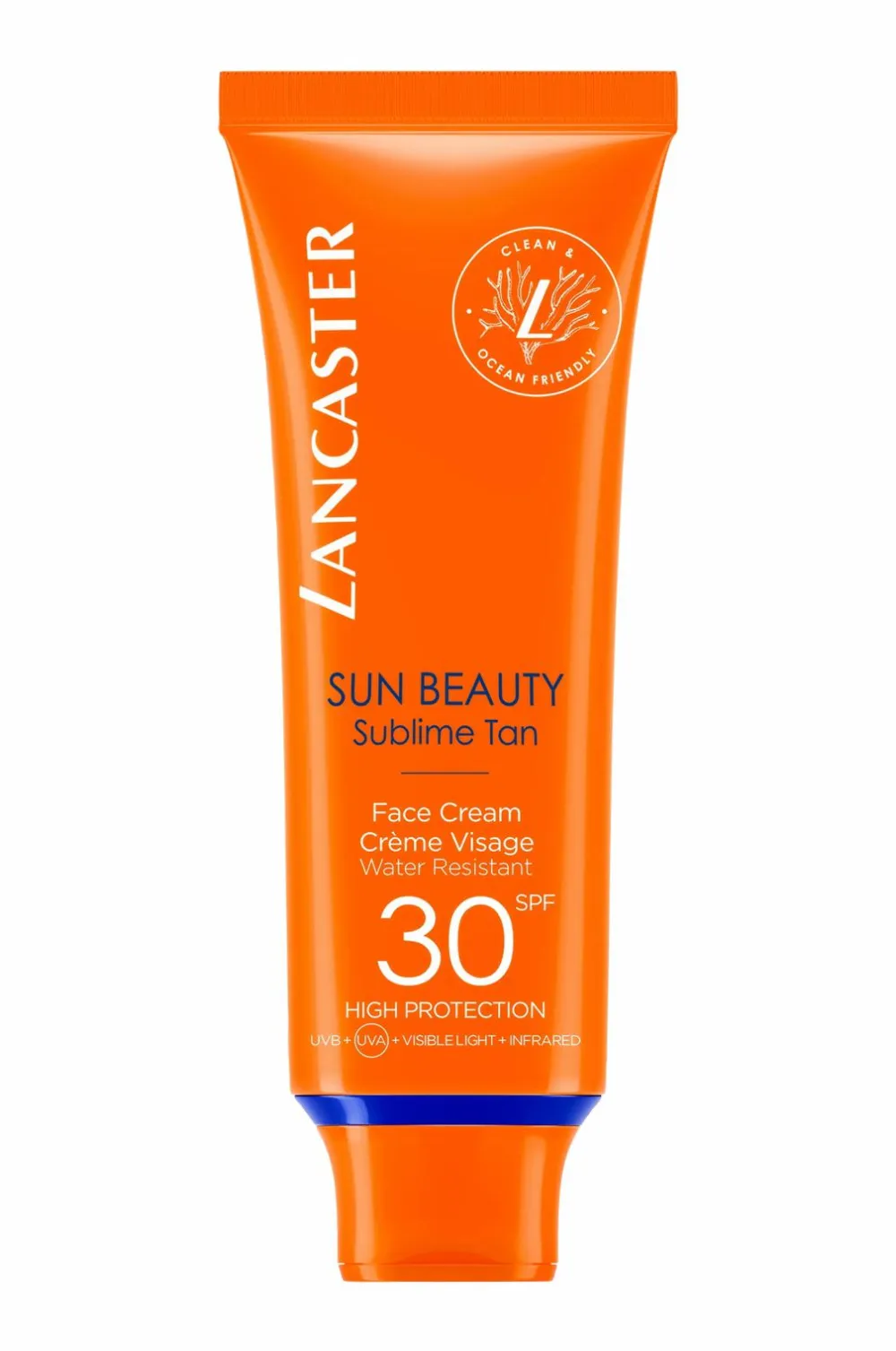 Lancasters mest avancerede solbeskyttelse findes i Sun Beauty Face Cream SPF30. Udover at fange 100% af solens spektrum*, hjælper dette rene, havvenlige og sensuelle solbeskyttelsesprodukt også med at reparere solskader på huden. Vores unikke formel, der er ultralet, ikke-fedtet og umiddelbart usynlig på huden, giver en frisk, gylden solbrun hud på to gange kortere soleksponeringstid.** Ansigtscremen blender ind i huden uden at efterlade hvide spor og tørrer ud til en perfekt, fløjlsagtig finish, der fremhæver hudens skønhed og giver den varig fugt.