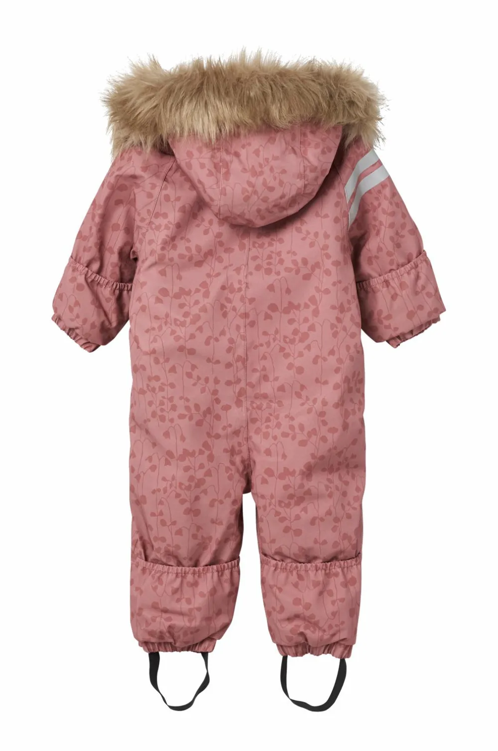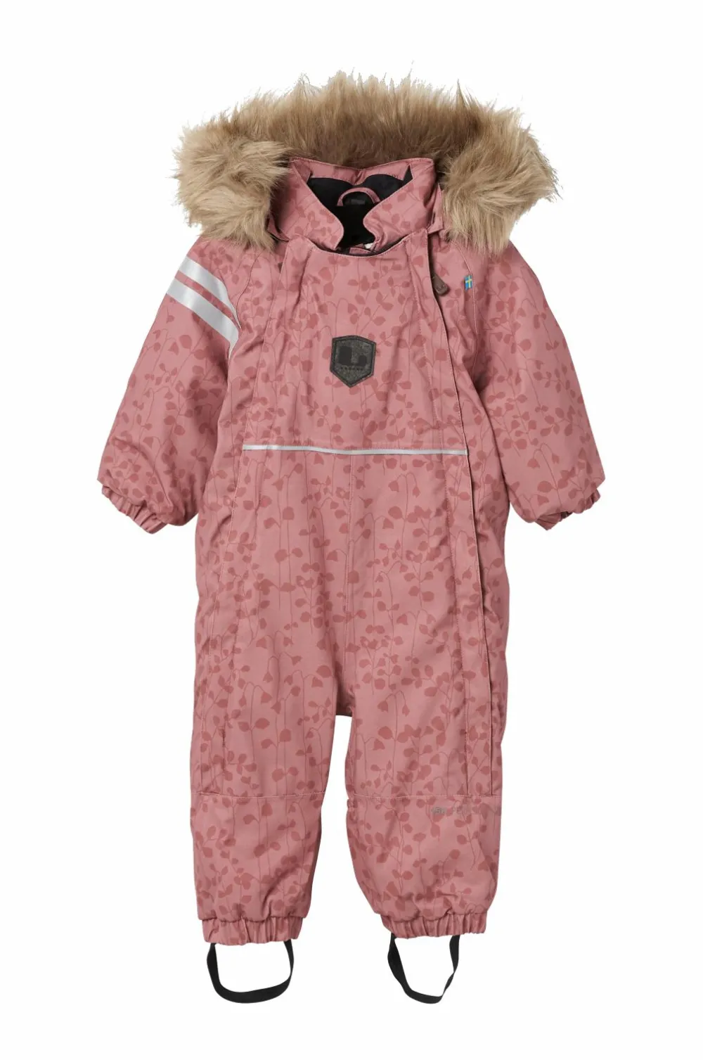 Aftagelig, foret hætte med aftagelig kant af kunstpels. Høj krave med børstet, blød tekstil på indersiden. To lynlåse går ned i det ene ben, hvilket gør dragten nemmere at tage på og af. Kan ombukkes ved hænder og fødder. Elastik i ærmekant og benkant. Elastiske, justerbare fodstropper samt refleksdetaljer.