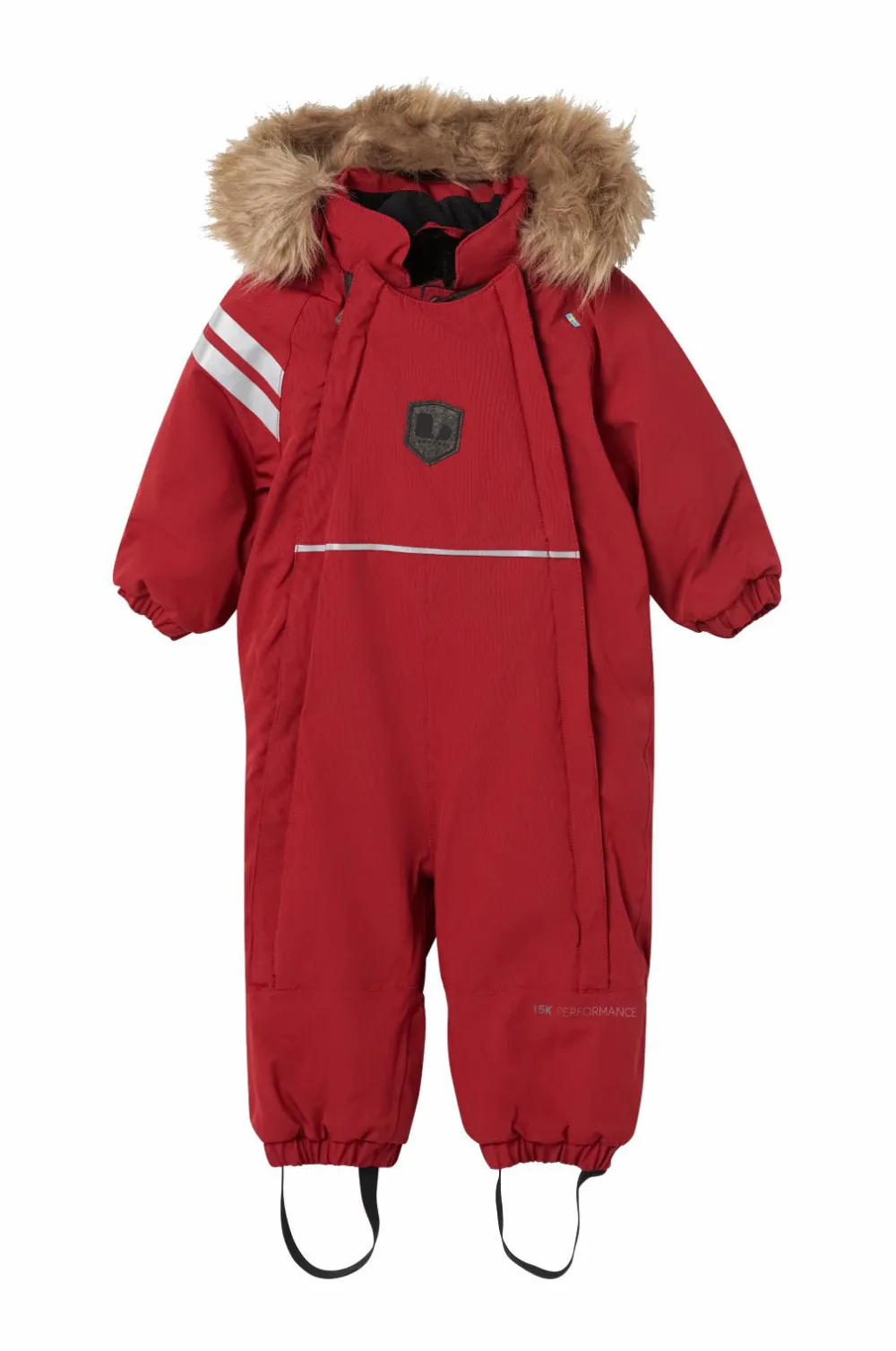 Aftagelig, foret hætte med aftagelig kant af kunstpels. Høj krave med børstet, blød tekstil på indersiden. To lynlåse går ned i det ene ben, hvilket gør dragten nemmere at tage på og af. Kan ombukkes ved hænder og fødder. Elastik i ærmekant og benkant. Elastiske, justerbare fodstropper samt refleksdetaljer.
