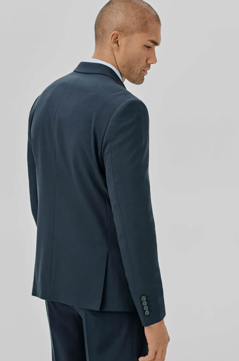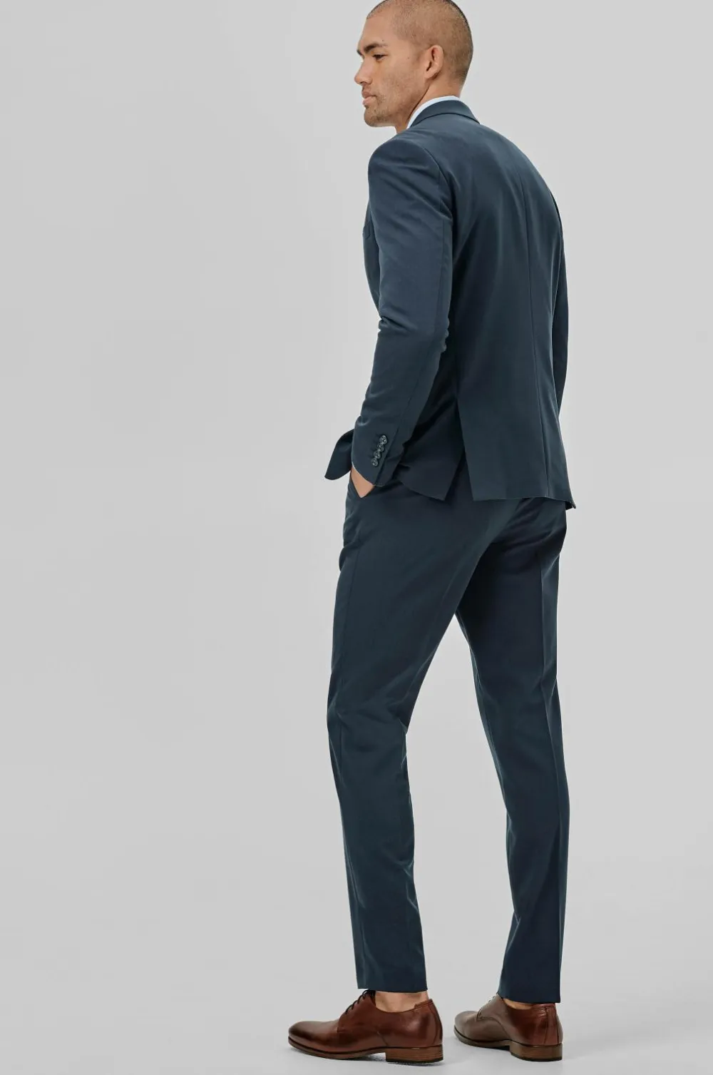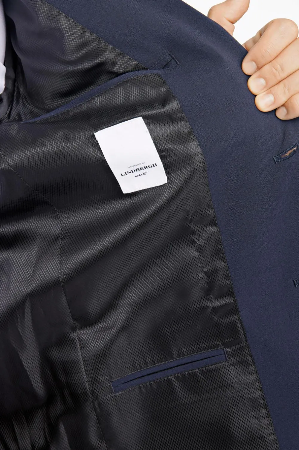 Jakkesæt fra Lindbergh med blazer og buks i klassisk model. Blazeren lukkes med to knapper og har fire pynteknapper i ærmekant. To lommer med lommeklap, en brystlomme og tre inderlommer. Let vatterede skuldre. Dobbelte slidser bagpå. Længde ca. 71 cm i str. M. Buksen har linning med to knapper, bæltestropper og gylp med lynlås. To lommer foran og to indsatte baglommer med knap. Benlængde ca. 82 cm i str. M.