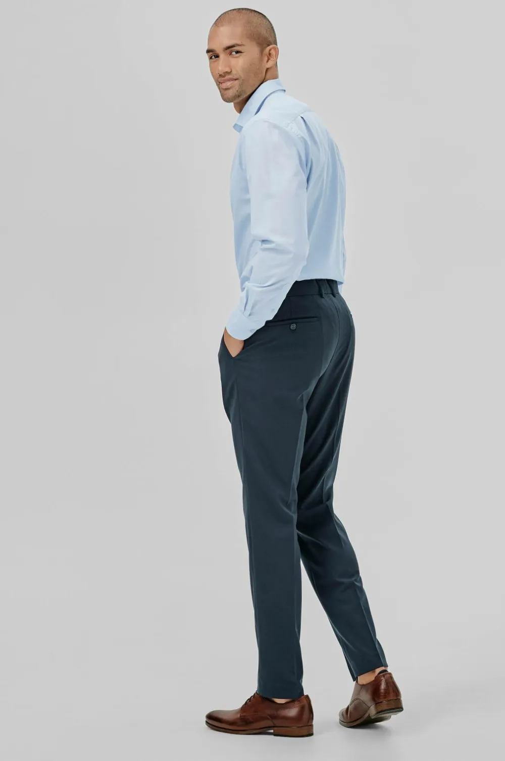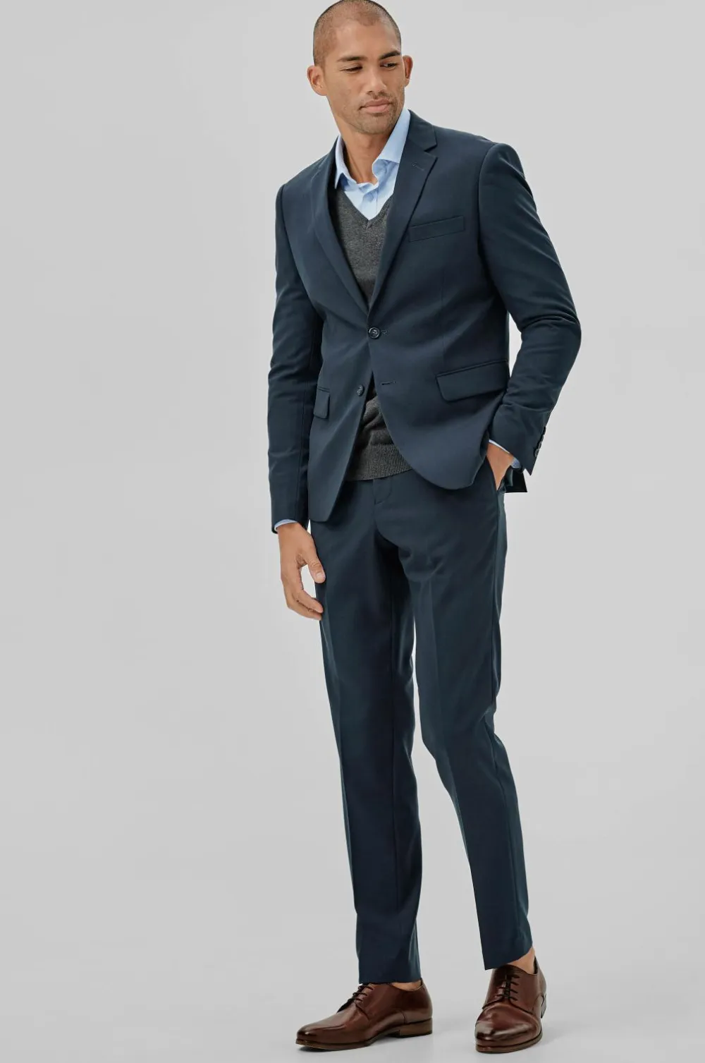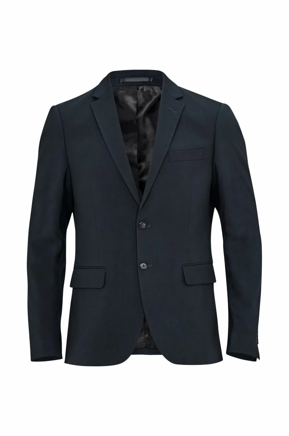 Jakkesæt fra Lindbergh med blazer og buks i klassisk model. Blazeren lukkes med to knapper og har fire pynteknapper i ærmekant. To lommer med lommeklap, en brystlomme og tre inderlommer. Let vatterede skuldre. Dobbelte slidser bagpå. Længde ca. 71 cm i str. M. Buksen har linning med to knapper, bæltestropper og gylp med lynlås. To lommer foran og to indsatte baglommer med knap. Benlængde ca. 82 cm i str. M.