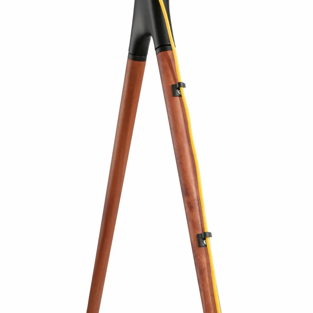 Gulvstativ i staffeli-design for stil og forbedret seeroplevelse. Fremstillet med ben i valnøddetræ og stålbeslag, komplet med sikkerhedswire, der sikrer stabilitet. Nem kabelhåndtering er inkluderet.