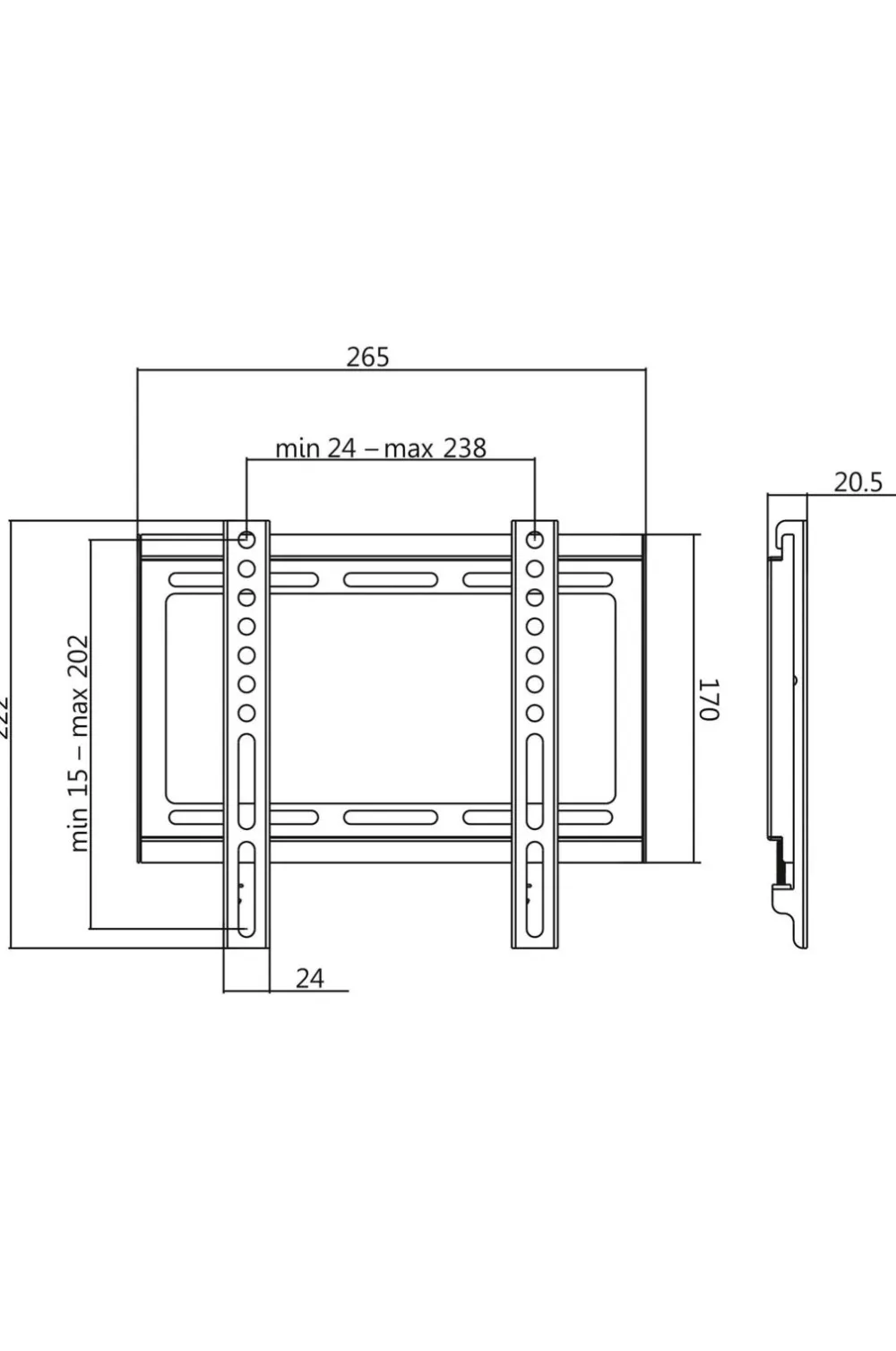 Max/min afstand mellem skruehuller på tv’ets bagside: 24-238 mm