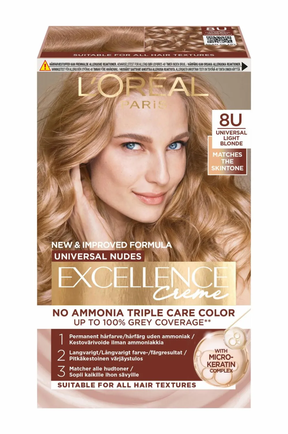 L’Oréal Paris Excellence Universal Nudes er en ammoniakfri permanent hårfarve til alle hårstrukturer. Formlen matcher alle hudtoner, giver dit hår næring og glans** samt dækker op til 100 % af grå hår*.