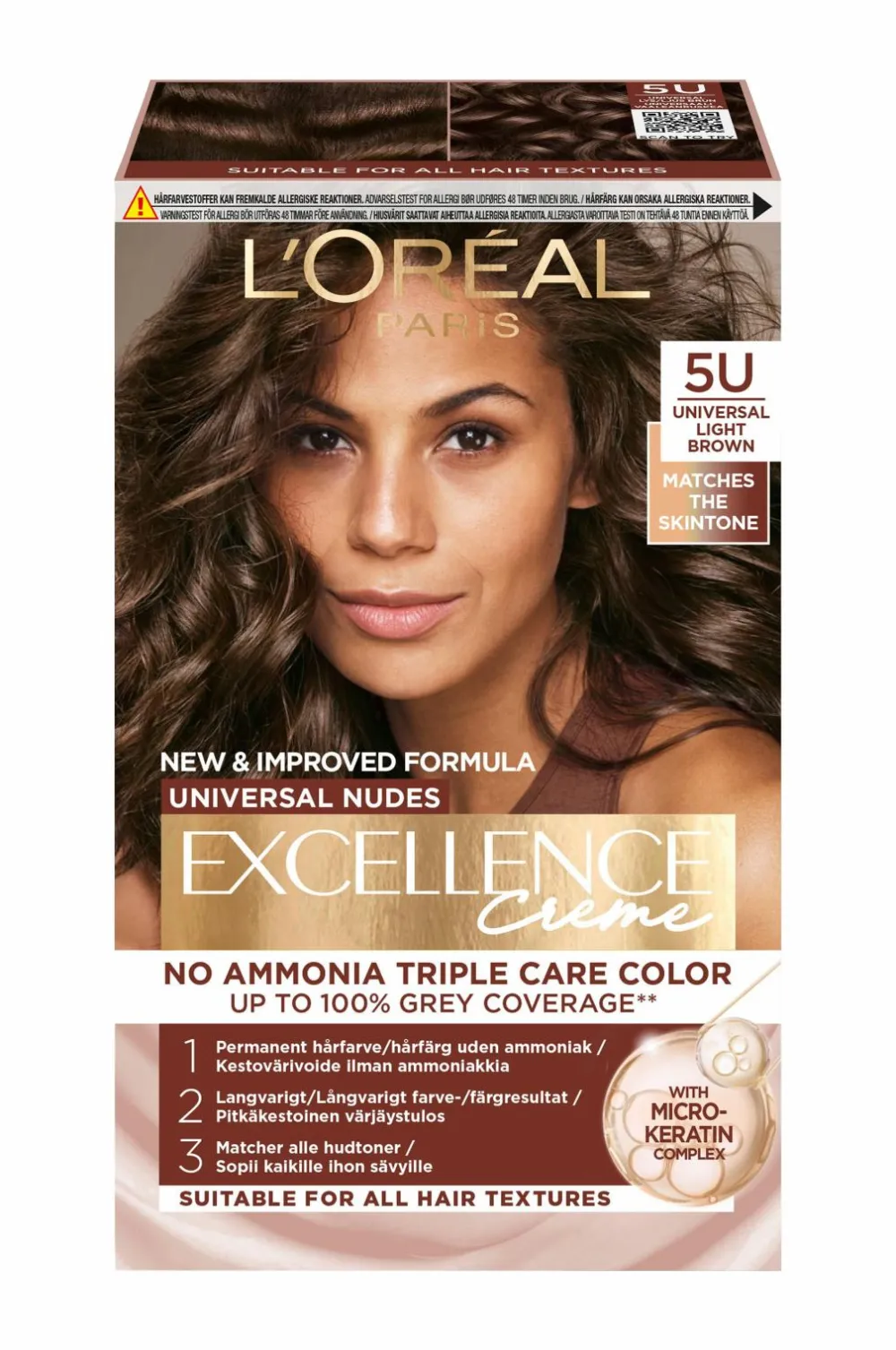 L’Oréal Paris Excellence Universal Nudes er en ammoniakfri permanent hårfarve til alle hårstrukturer. Formlen matcher alle hudtoner, giver dit hår næring og glans** samt dækker op til 100 % af grå hår*.