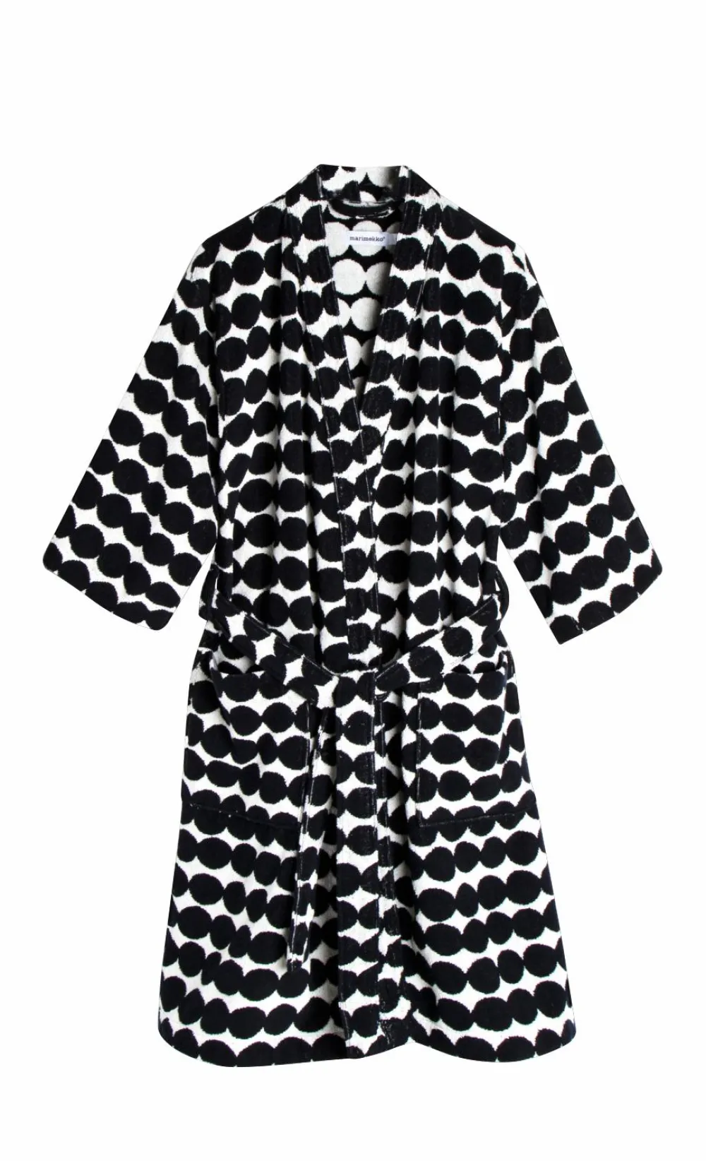Badekåbe af tyk bomuldsfrotté med Räsymatto-mønster. Badekåben har store lommer foran og aftageligt bindebælte. Indersiden har samme mønster i modsatte farver.