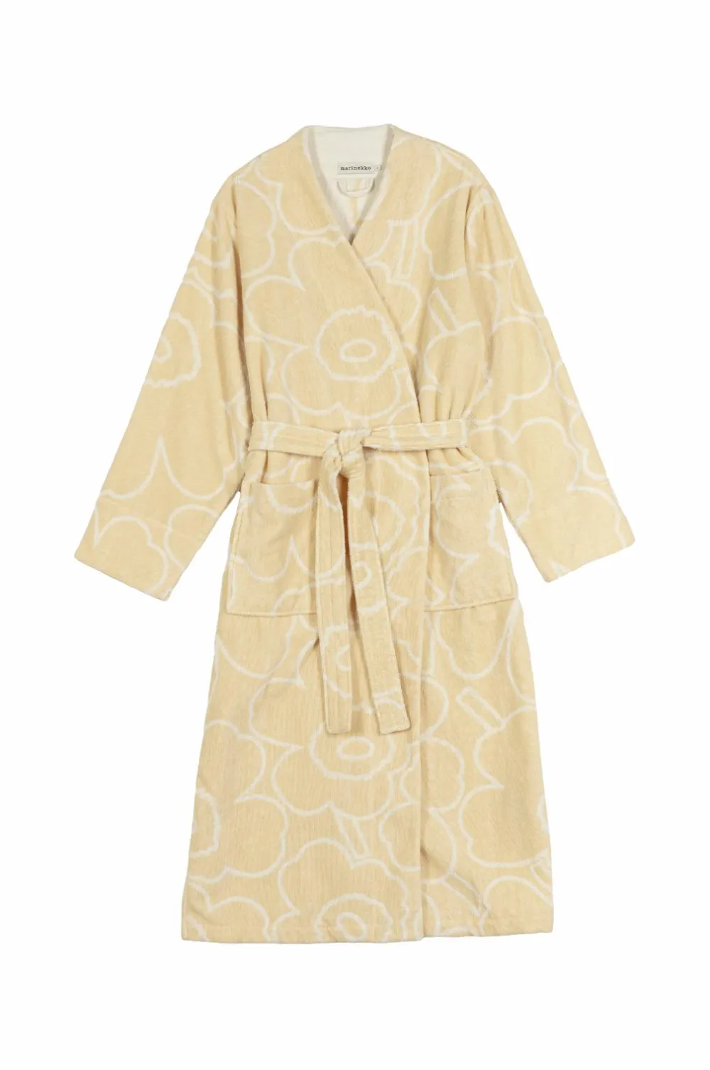 Den mønstrede badekåbe Piirto Unikko er fremstillet af bomuldsfrotté. Kåben har lange ærmer med brede opsmøg ved håndleddene, påsatte lommer foran, et separat bælte og bæltestropper. Produktet er fremstillet af 100 % økologisk bomuld. Piirto Unikko er en stiliseret, luftig variation af den elskede blomst, som Maija Isola skabte i 1964. Den nikker til minimalisme, mens den fremhæver de grafiske linjer i Unikko -mønsteret.