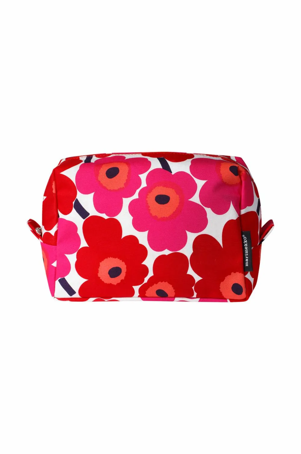 Vilja stor makeup-pung i bomuld med Mini Unikko-mønsteret. Printet i Helsingfors. Åbning med lynlås og inderside af nylon med to rum til børster og pensler.