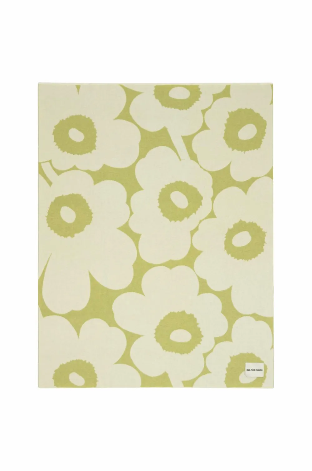 Dette jacquardstrik-tæppe har mønsteret Unikko og Marimekko-mærket på den nederste kant.
