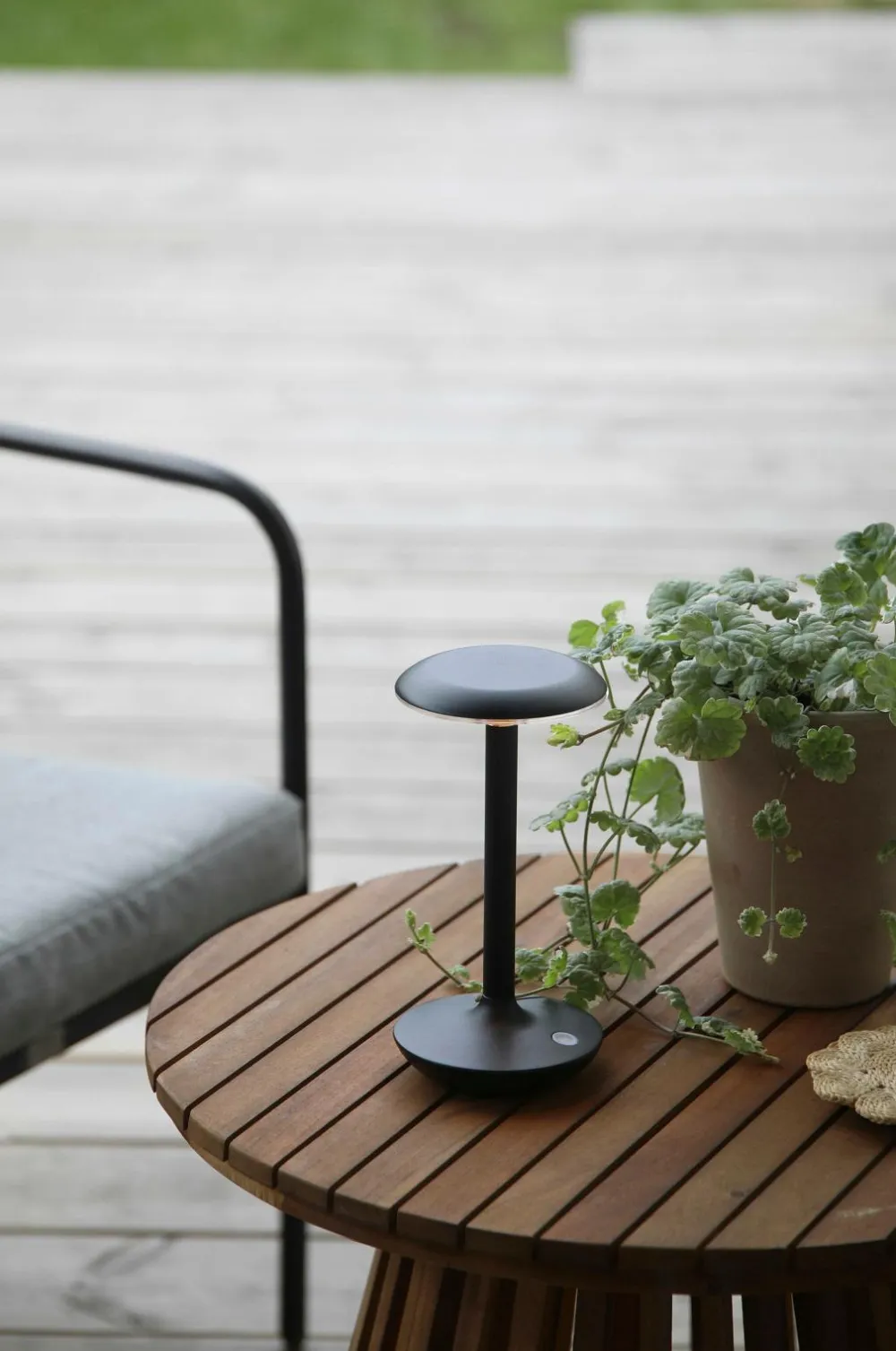 Petit Bordlampe fra markslöjd. Fod og skærm i metal. Dæmpbar og justerbar farvetemperatur (2000k, 3000k og 4000k) til udendørs brug ip44. Genopladelig 1800mah. Opladningsbase med usb-kabel medfølger.