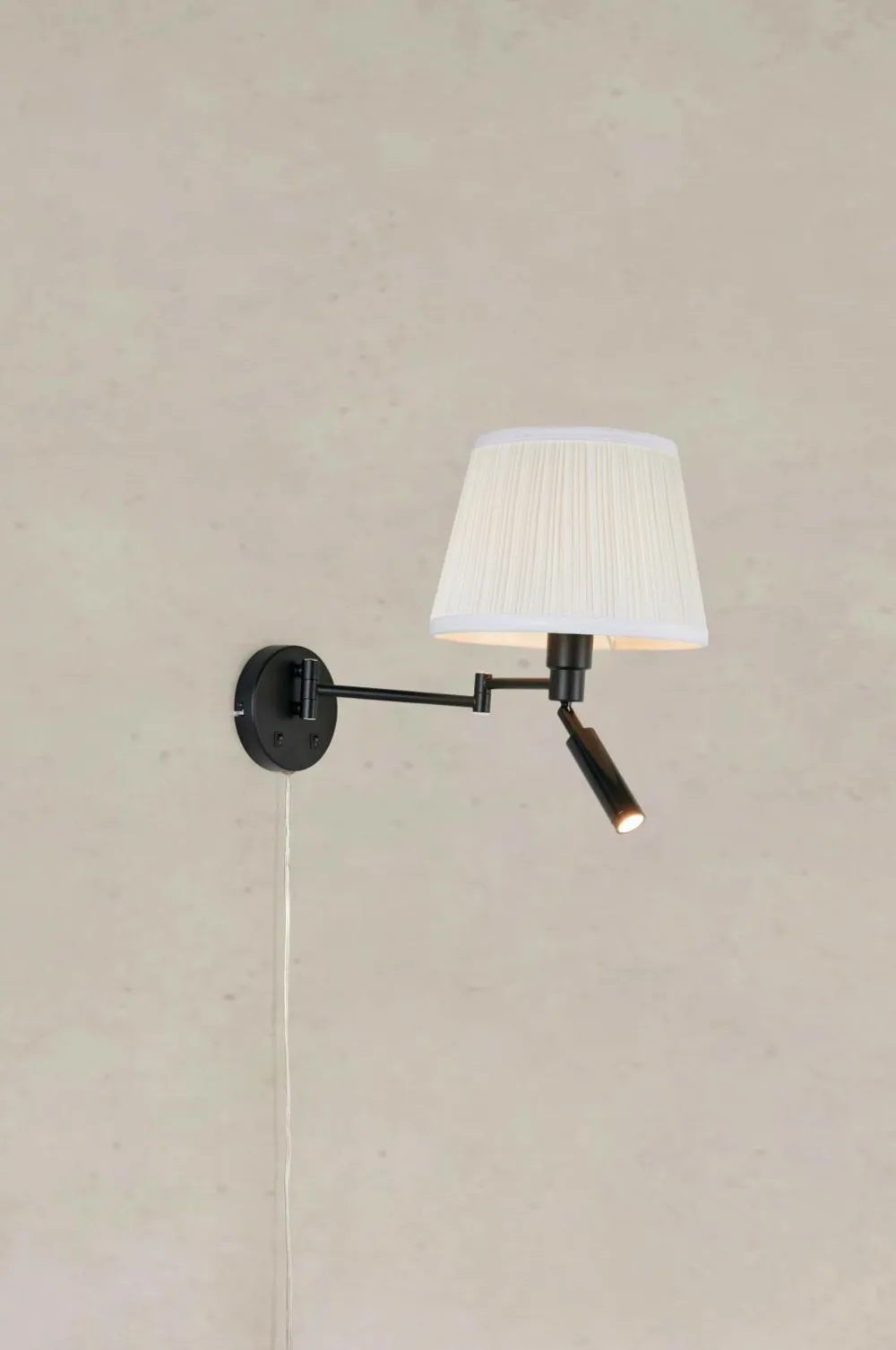 Pivot væglampe fra markslöjd. Væglampe i metal med to arme – en svingarm med tekstilskærm og justerbart led-læselys til retningsbestemt belysning. Tekstilskærmen har en diameter på 25 cm og giver en behagelig glød. Monteret med beslag. Integreret samledåse i vægpladen giver mulighed for nem tilslutning til fast elinstallation. Klasse ii. 1xe27+led, maks. 40w, 4w. E27-lyskilde medfølger ikke.