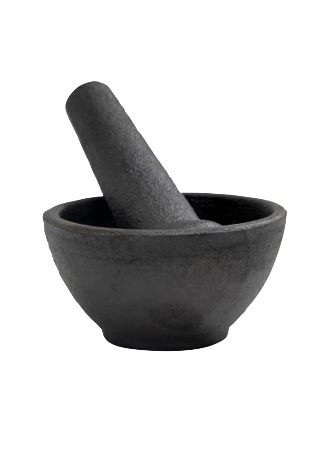 <Morter af støbejern, der måler 8,5 cm i diameter og 4,5 cm i højden.