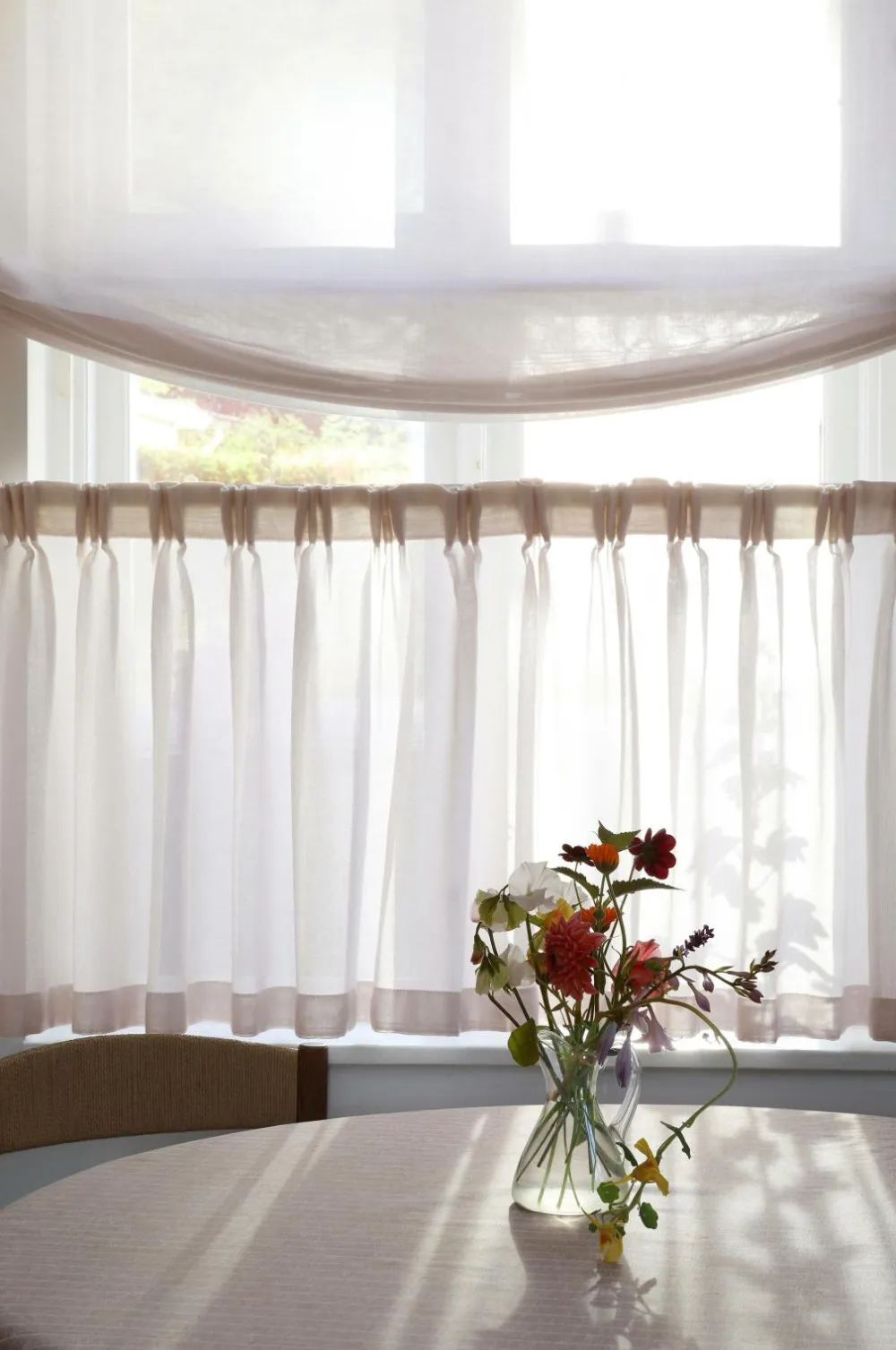 Klassisk gennemsigtigt cafégardin syet med gardinbånd, der lader lyset trænge ind. Gardinet har et skræddersyet look med klassiske usynlige sidekanter og en dobbelt foldet kant forneden. Der medfølger 4-fingerkroge. Fingerkrogsophæng passer til alle skinner med glidere og også standard gardinstænger med gardinringe. 4-finger krog bruges til at skabe smukke fingerfolder i gardinet, der giver et veltilpasset indtryk og gør, at gardinet falder godt. Stoffet opfylder alle krav til flammesikkerhed for gardiner til offentlige miljøer og er Oeko-Tex® Standard 100-certificeret, hvilket er en garanti for, at det ikke indeholder sundhedsskadelige stoffer. 60 graders skånsom maskinvask eller kemisk rensning. Bredde 290 cm. Gardinet fås i højderne 40, 65 og 85 cm. Sælges enkeltvis.