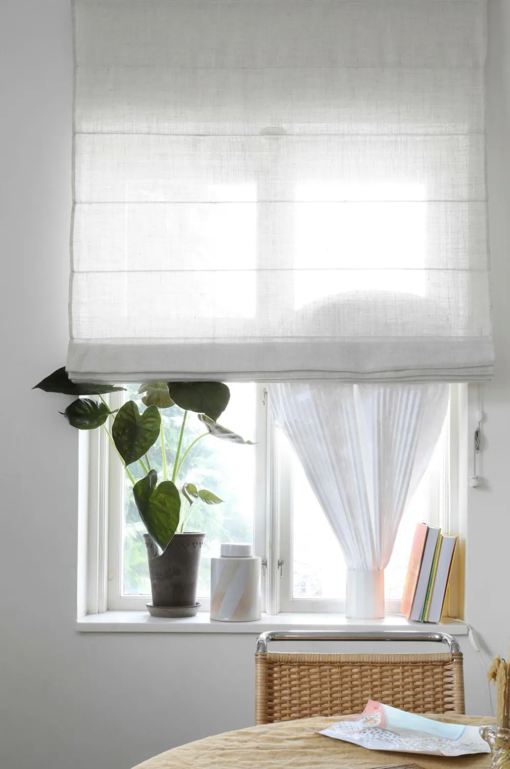 Mimous liftgardin er 220 cm langt hvilket gør at det også passer i lidt højere vindue samt de fleste glasdøre. Stoffet er vævet med kraftige hørtråde og genindvundet polyester og har en smuk tekstur, som lyset filtrerer igennem, men stadig er let nok til at se igen. Liftgardinet er skræddersyet med smalle sidefolder og med lægter, der giver stramme læg ved foldning. Afstanden mellem lægterne gør, at liftgardinet foldes smukt sammen, uanset hvilken højde du vælger at have det på. Det er lige så fint i fuld optrukket position, som når det hænger helt ned eller er højdejusteret, hvor sømmene til lægterne er placeret. Det kan naturligvvis justeres frit. Stoffet er monteret med velcrobånd på en stabil aluminiumsprofil, der kan monteres både i loft og på væg. Linerne fra lægterne samles i en linedeler som er designet til at blive separeret, hvis dit barn eller et husdyr bliver viklet ind i linerne. Længst nede på snøren af vævet svensk hør sidder en klassisk porcelænsknop fremstillet i Bromölla. Beslag og snorholder medfølger. Set forfra sidder snoretrækket i højre side. Det er vigtigt at snøre linen ordentligt rundt om knoppen hver gang højden justeres, så der ikke hænger lange snore ned, som små børn eller husdyr kan blive viklet ind i. Stoffet er OEKO-TEX® Standard 100 certificeret, det vil sige at produktet er testet for at sikre, at det ikke indeholder sundhedsskadelige stoffer.