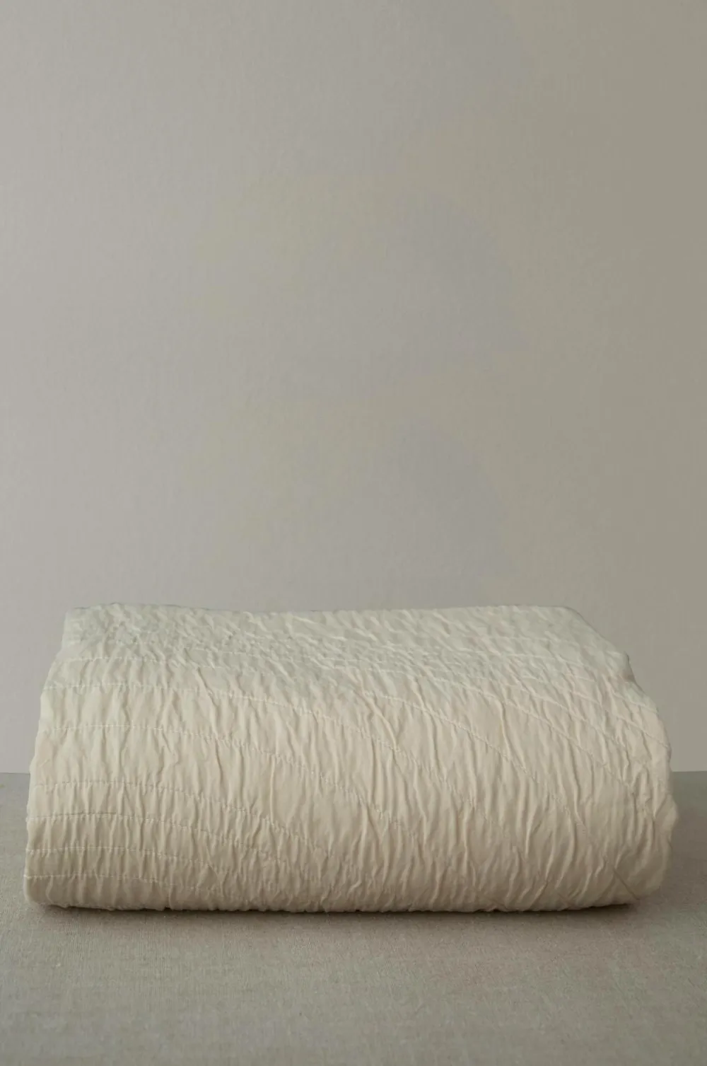 Quilt lavet af ældre sengetæpper som er farvet om med GOTS-certificeretfarvepigment i Sverige. Genbrug af materialer i stedet for ny produktion er et mere bæredygtigt valg og et skridt til at reducere tekstilspild. Cirkelquiltet over- og underside i natur.