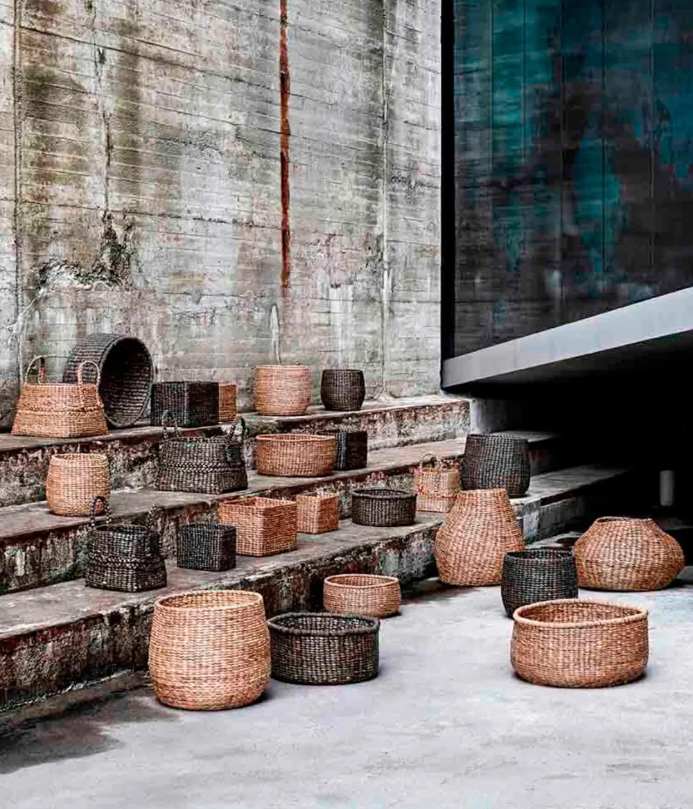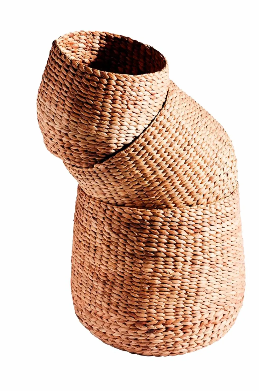 Kurvesættet Round er fremstillet af flettet vandhyacint. Det er et sæt med tre kurve i størrelserne S, M og L som kan bruges til opbevaring eller som vasketøjskurv. Str. L: Højde 48 og diameter 53 cm. M: H 38 cm og diameter 42 cm. S: Højde 32 cm og diameter 33 cm.