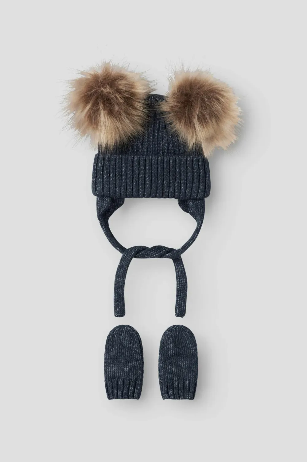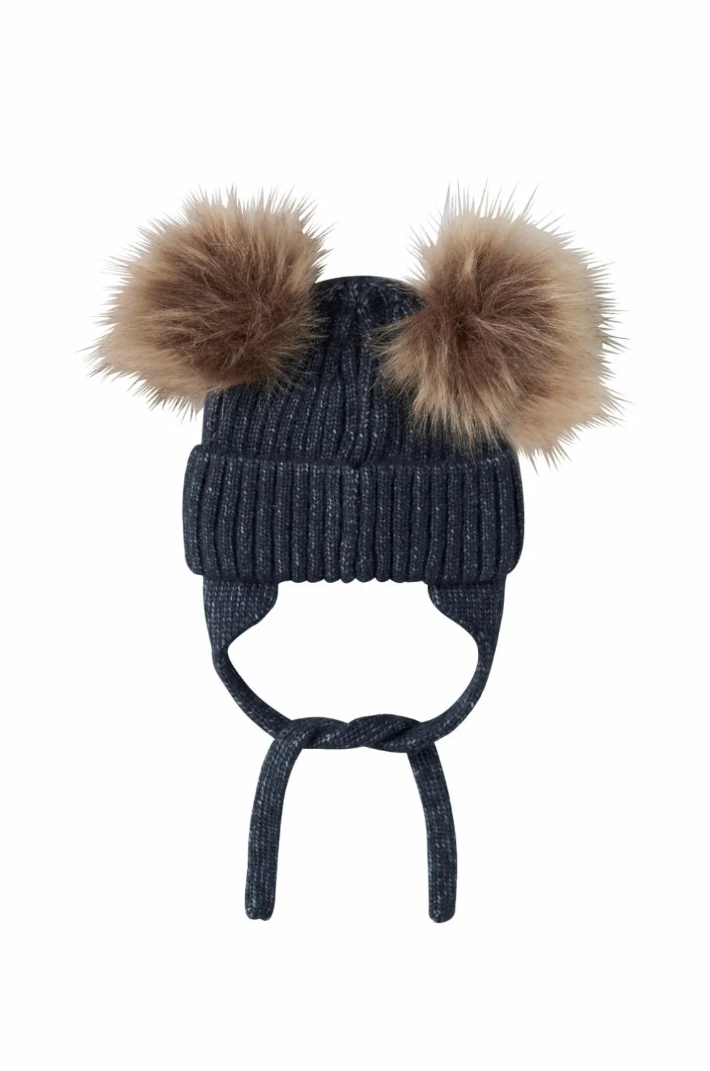 • Ribstrikket babyhue med to pomponer i kunstskind og bindbart bånd under hagen