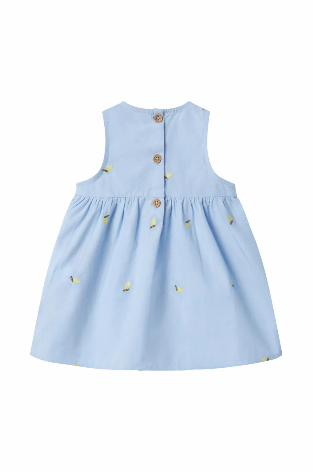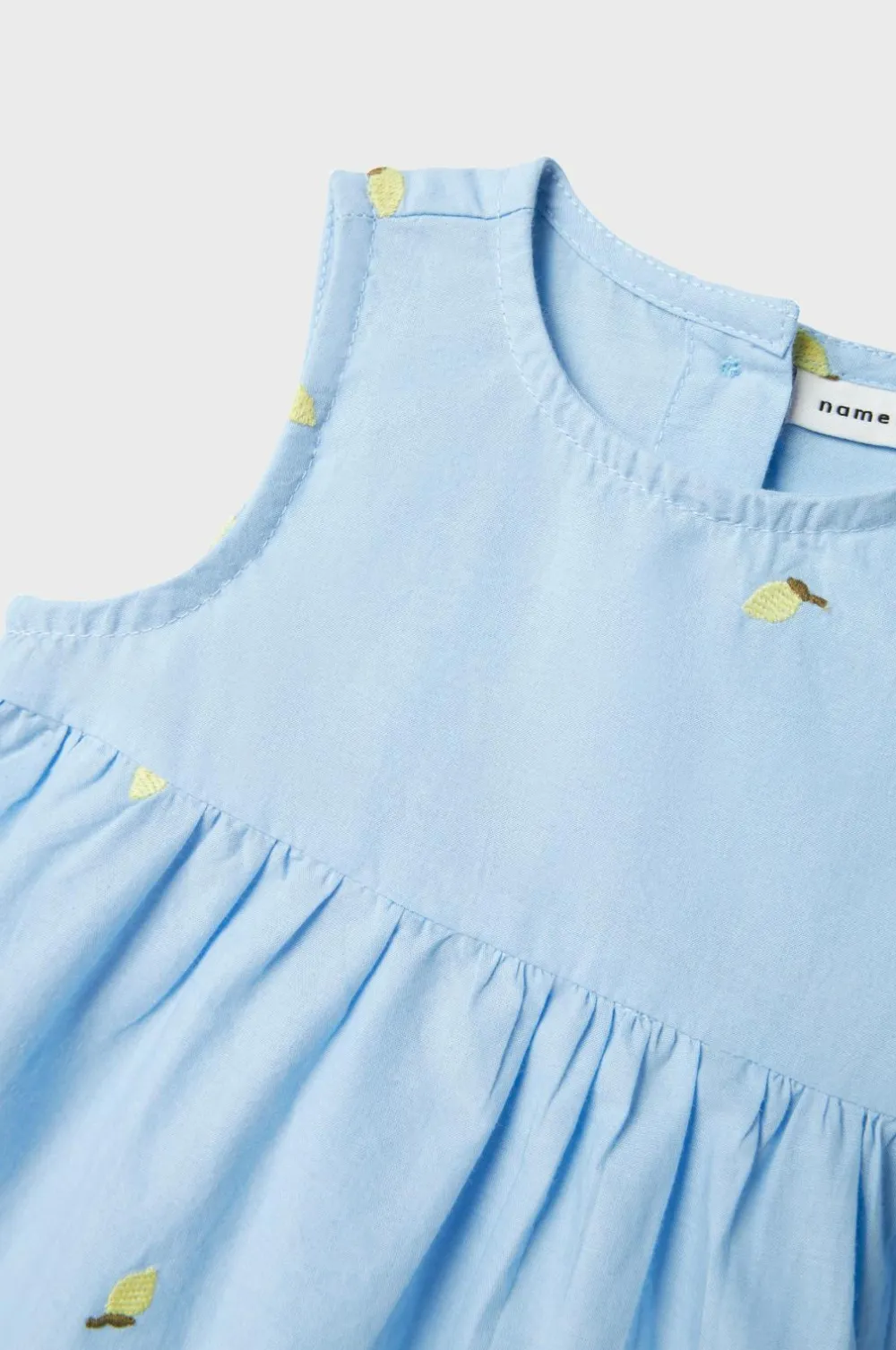 • Ærmeløs kjole i bomuld med broderede jordbær hele vejen rundt