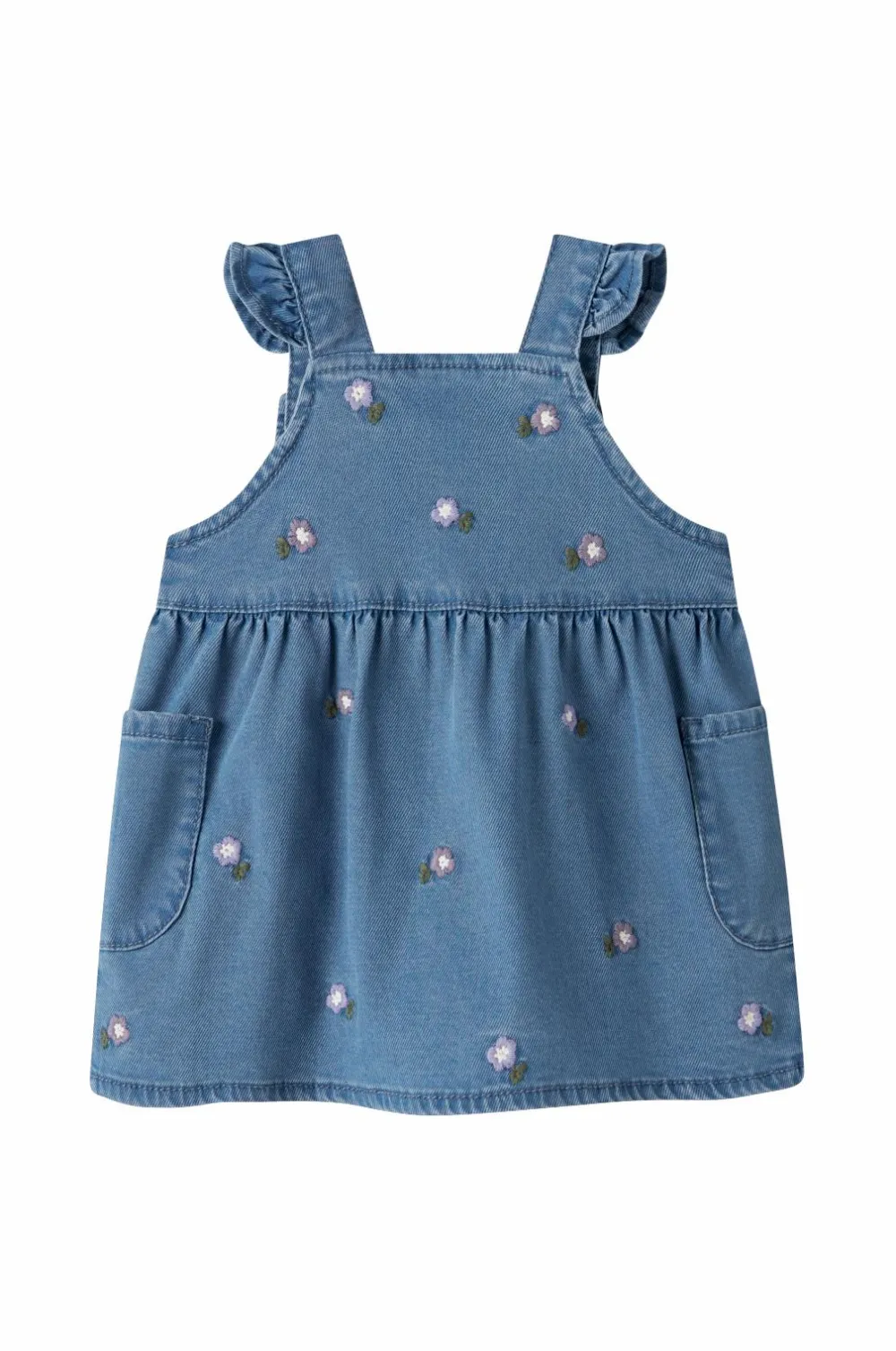 • Overallkjole i denim med broderede blomster hele vejen rundt