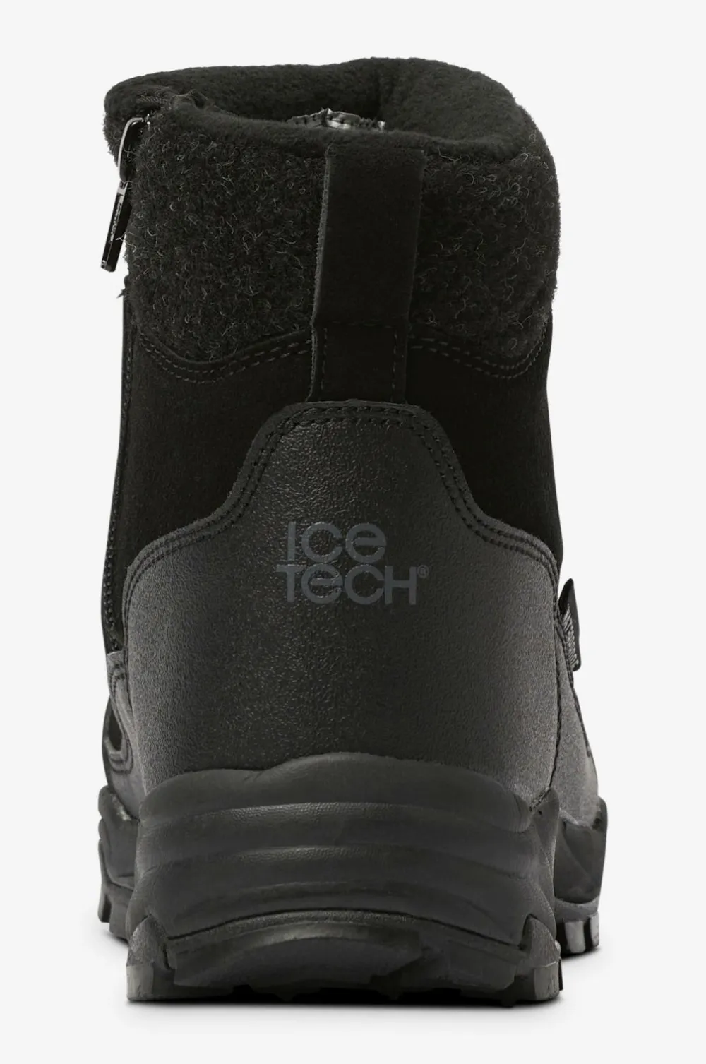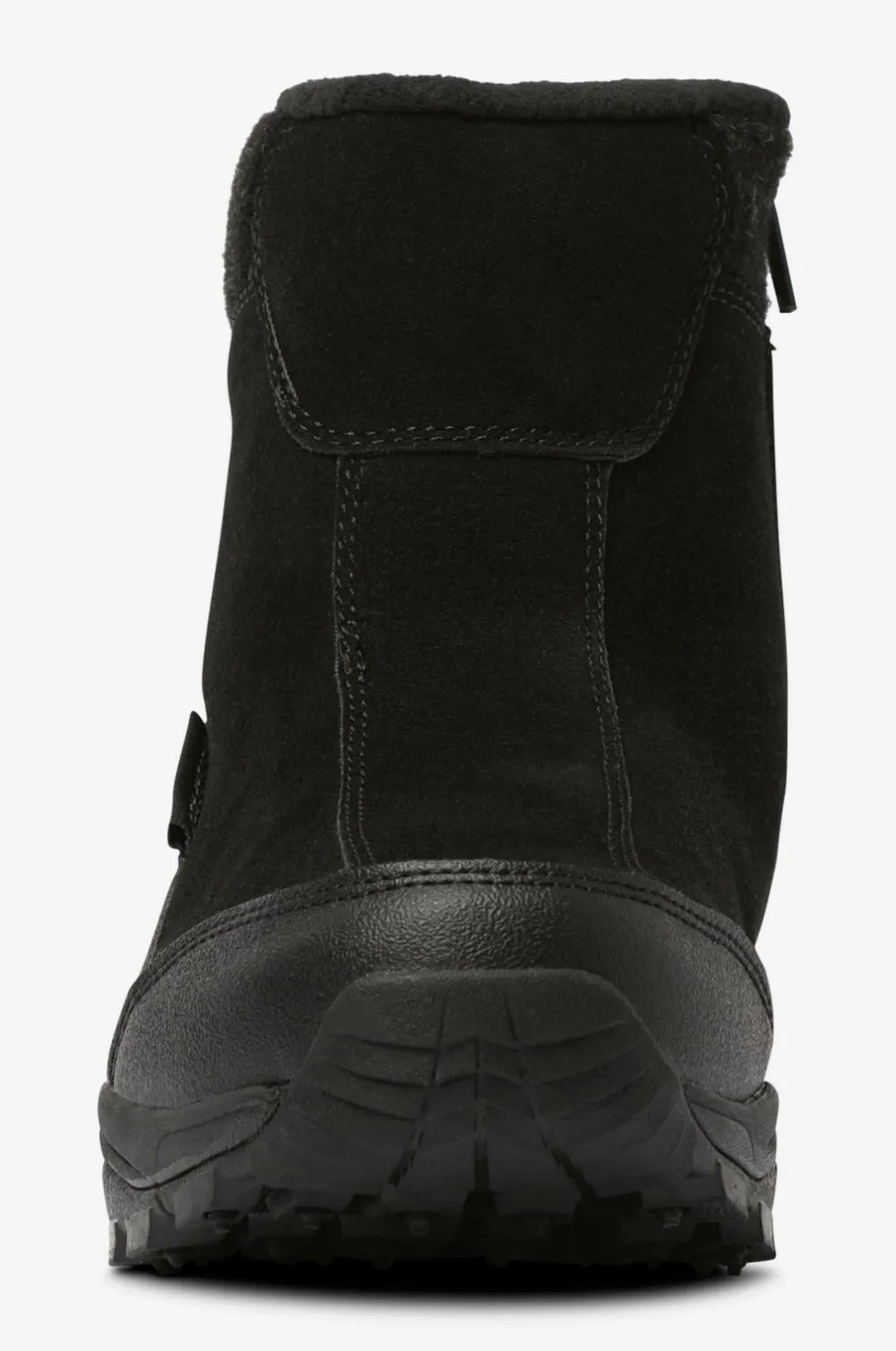 Varmforede vinterstøvler i slidstærk imiteret ruskind med forstærkninger i imiteret skind. Lynlås med tekstilkile i siden. Varmende for i blød fleece med god åndbarhed. Ydersålen har dupper, både i plast og i metal, for at give et så godt greb som muligt på vinterunderlag. Trækstrop bagpå.