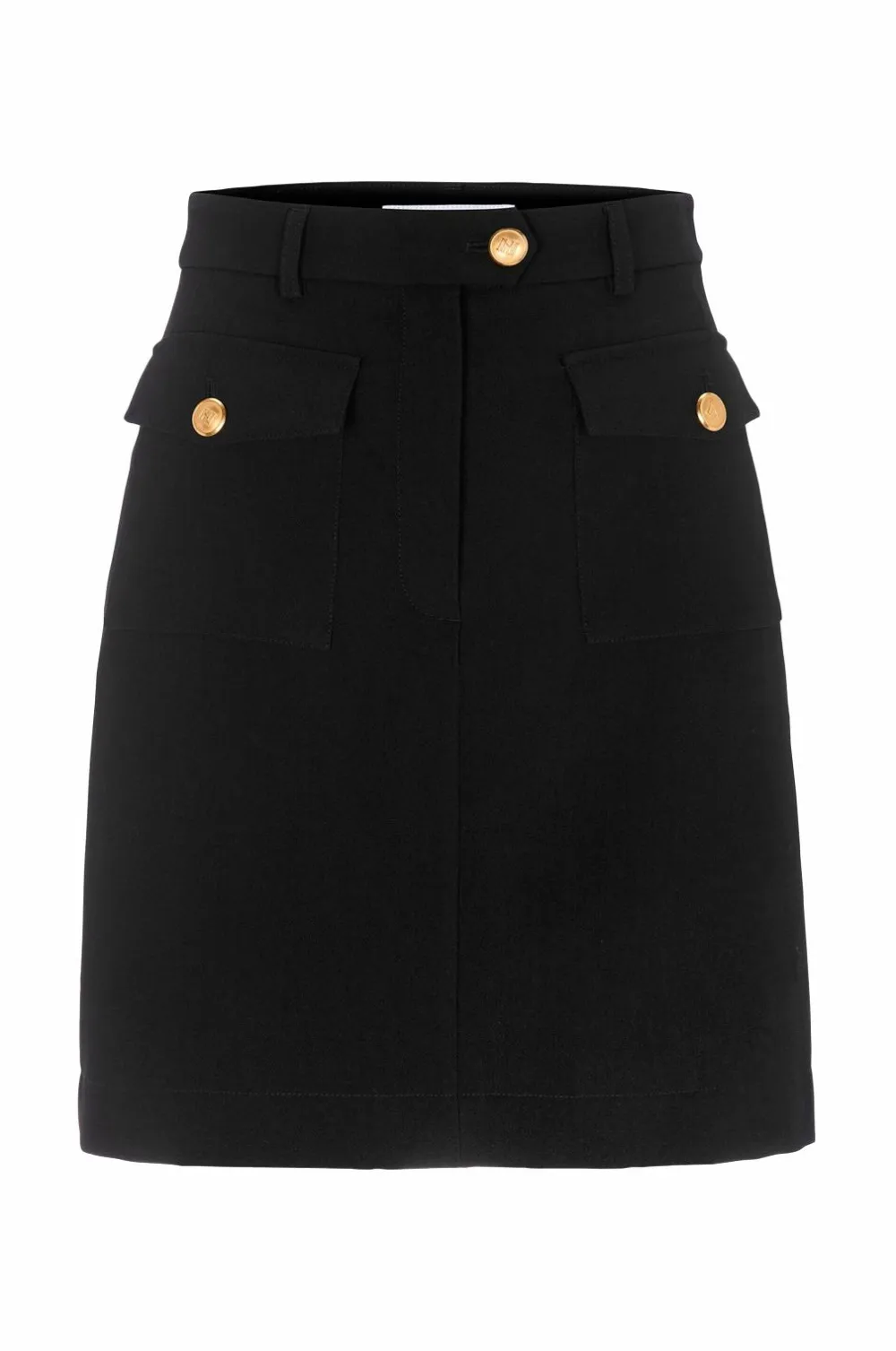 Kort nederdel lavet af crepe-stof med tungt fald. Påsatte lommer foran pyntet med logoknapper lavet af gyldne metalsknapper.