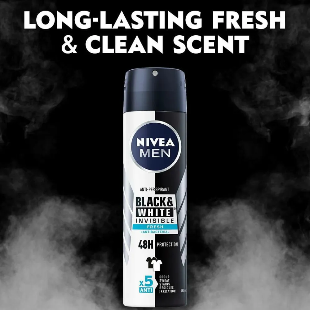 NIVEA MEN Black & White Invisible Fresh antiperspirant deodorant forhindrer hvide mærker på mørkt tøj og gule pletter på lyst tøj. Den unikke formel giver dig en frisk følelse og beskytter dig i 48 timer mod sved og kropslugt men er samtidigt skånsom mod din hud. Desuden beskytter antiperspiranten dig mod lugt, sved, pletter, rester og irritationer. Dermatologisk testet.