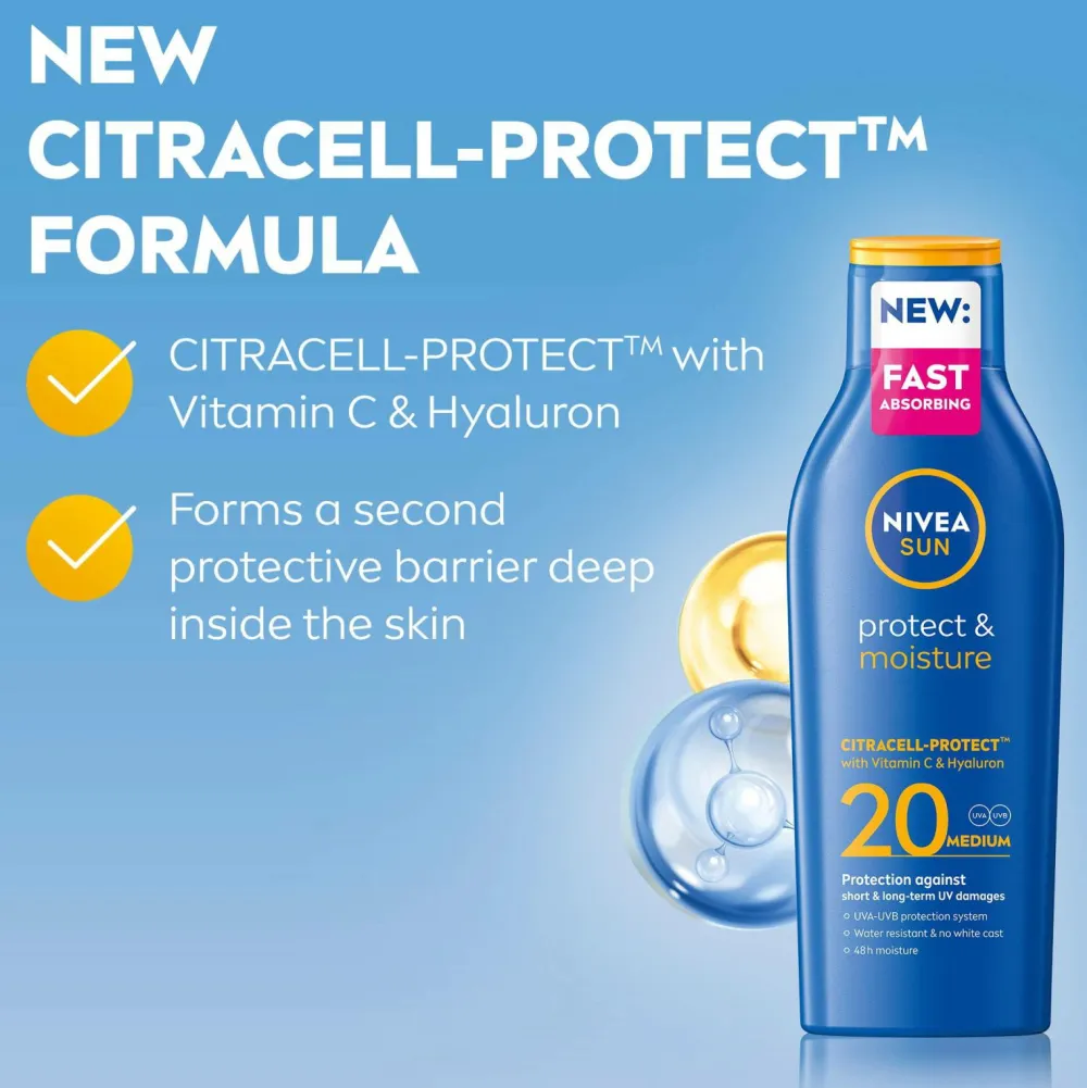Nivea Sun giver din hud al den pleje, den har brug for. Ved at kombinere effektiv UV-beskyttelse med avancerede aktive ingredienser, er din hud beskyttet mod solens stråler, mens de fugtgivende og plejende ingredienser virker hele dagen.