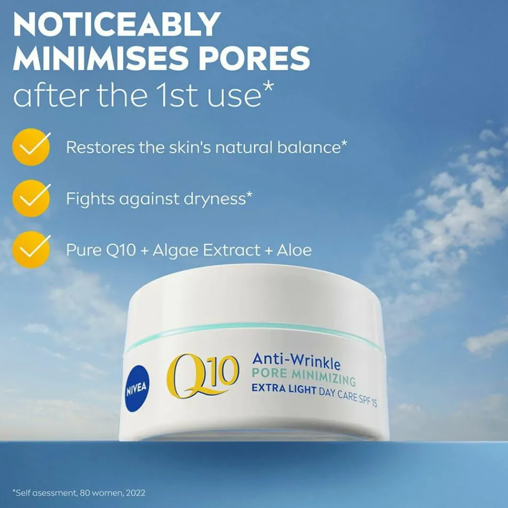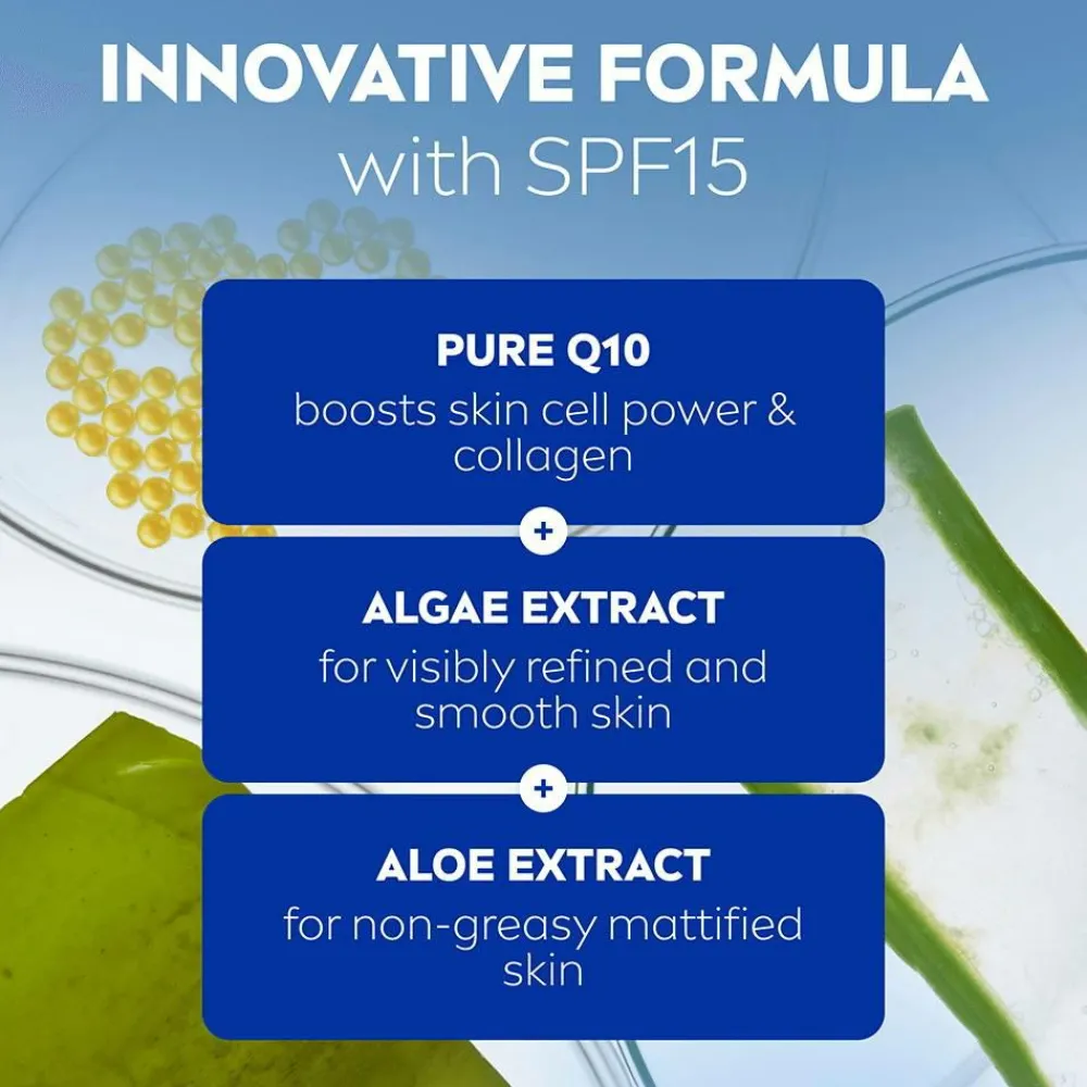 Nivea Q10 Power Pore Refining Day er specielt udviklet til at passe til behovet ved kombineret hud. Formlen indeholder naturligt Q10 og alger og reducerer synlige rynker på fire uger samt styrker huden på to uger. Indeholder SPF15 med UVA- og UVB-filtre, der beskytter huden mod rynker, alderspletter og for tidlig ældning forårsaget af farlig UV-stråling. Dermatologisk testet.