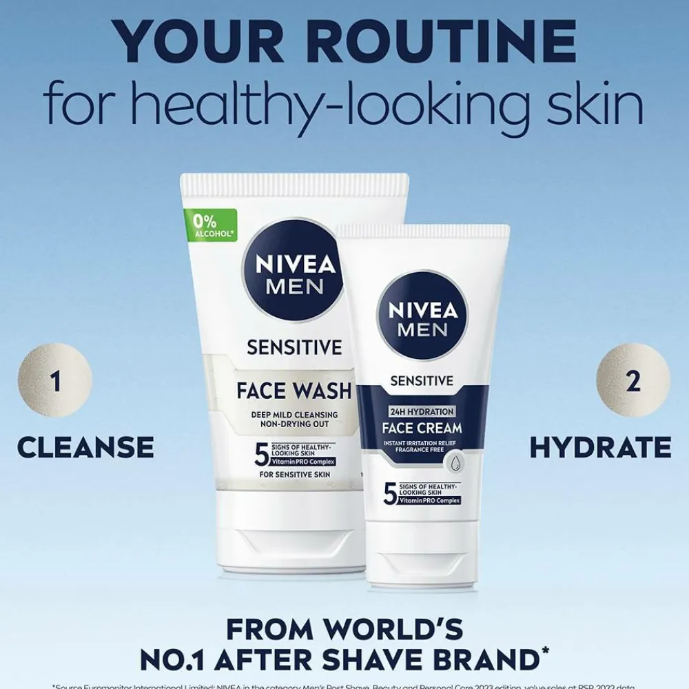 Fugtgivende ansigtscreme, der er specielt udviklet til følsom hud og giver øjeblikkelig lindring af irritation. Den avancerede formel giver ikke kun 24-timers fugt, men går også videre end det for at give omfattende hudpleje og mindre følsom hud ved regelmæssig brug. Beriget med E-vitamin, Provitamin B5 og kamilleekstrakt beroliger og revitaliserer cremen huden og efterlader den glat og blød. Den lette og ikke-klæbende konsistens er nem at påføre og absorberes hurtigt uden at efterlade rester. Ansigtscremen er designet til daglig brug og skaber en beskyttende barriere, der skærmer følsom hud mod miljømæssige faktorer. Denne ansigtscreme er et pålideligt valg for mænd, der er på udkig efter et produkt, der tager hensyn til følsom hud og giver langvarig næring. Cremen er dermatologisk testet og er duft- og alkoholfri (ingen ethylalkohol). 96 % ingredienser af naturlig oprindelse og fuldt genanvendelig tube.