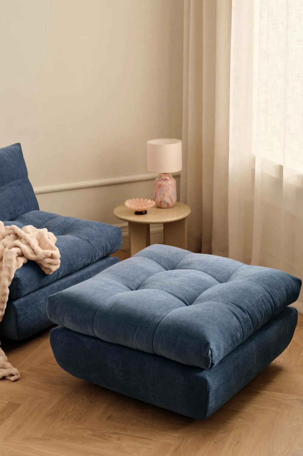 Denne puf er en perfekt balance mellem form og funktion. Kombinerer god komfort med et elegant look. Rammen er med nozag-fjedre. • Skelet i Bøg • Ben i egetræ • Fyld i polyetherskum