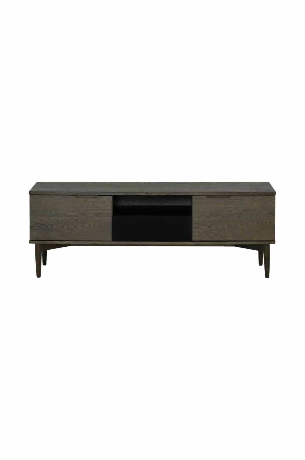 Moderne mediebænk i lakeret eg. 2 opbevaringsskabe, 1 hylde og 1 opbevaring med nedfældelig luge.